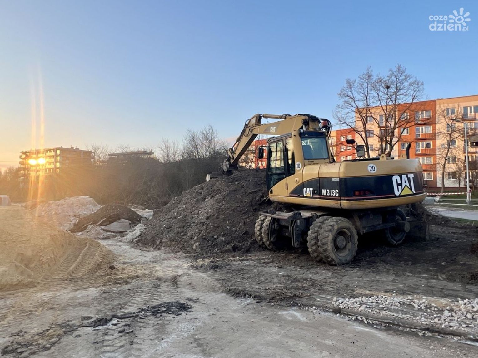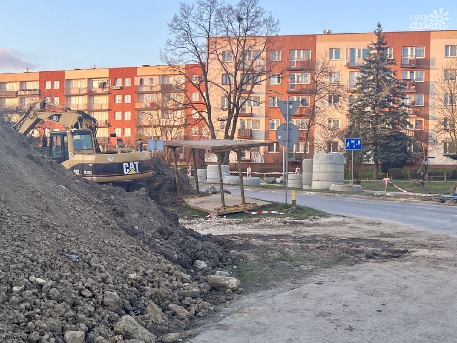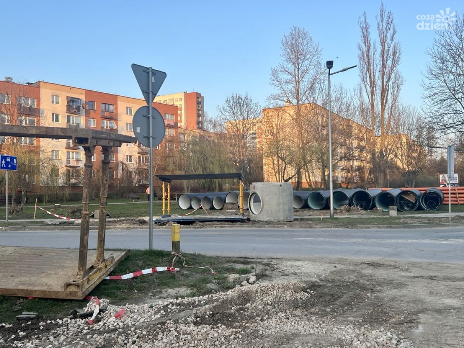Na ulicy Klonowej odhumusowano teren, czyli usunięto wierzchnią warstwę gleby, organizowane jest zaplecze budowy wykonawcy, rozpoczęła się budowa kanalizacji deszczowej.