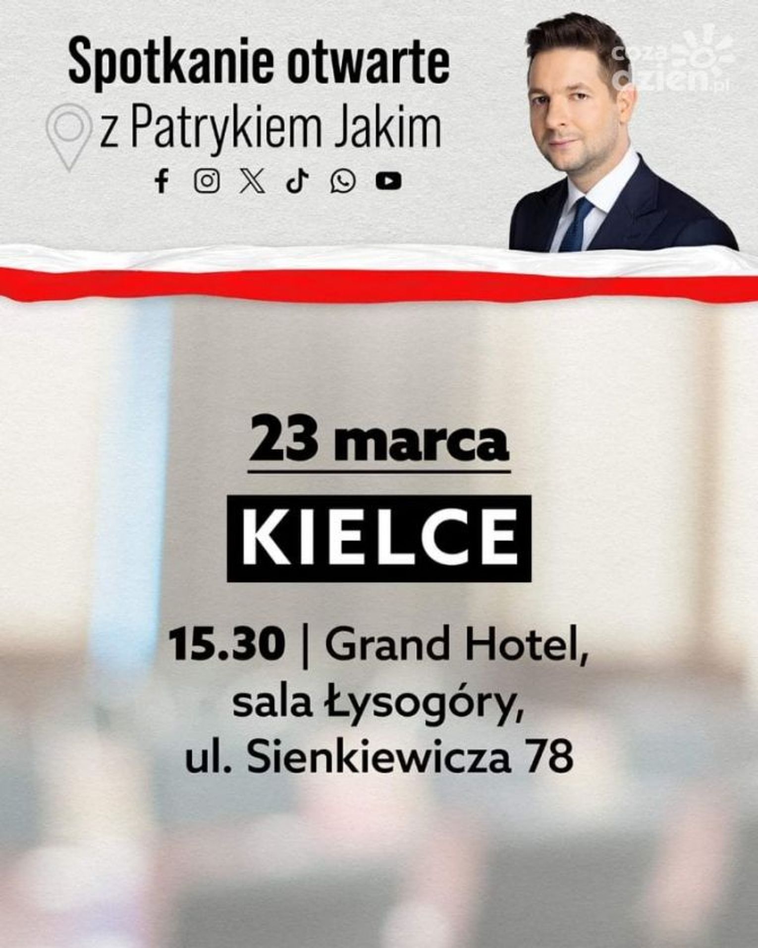 O godz. 15:30 w Grand Hotelu w Kielcach ul. Sienkiewicza 78, sala Łysogóry będzie miało miejsce otwarte spotkanie z posłem do PE Patrykiem Jakim. Wcześniej, o godzinie 14:00 w Mniowie odbędzie się konferencja posła do PE Patryka Jakiego poświęcona wyborom samorządowym i rewitalizacji Mniowa.