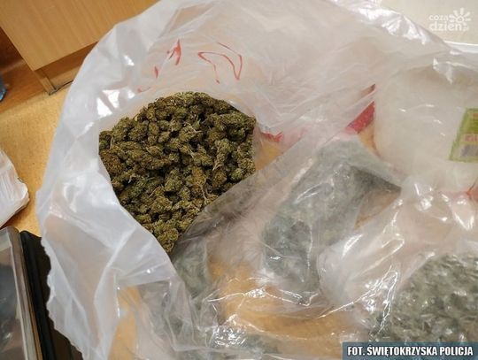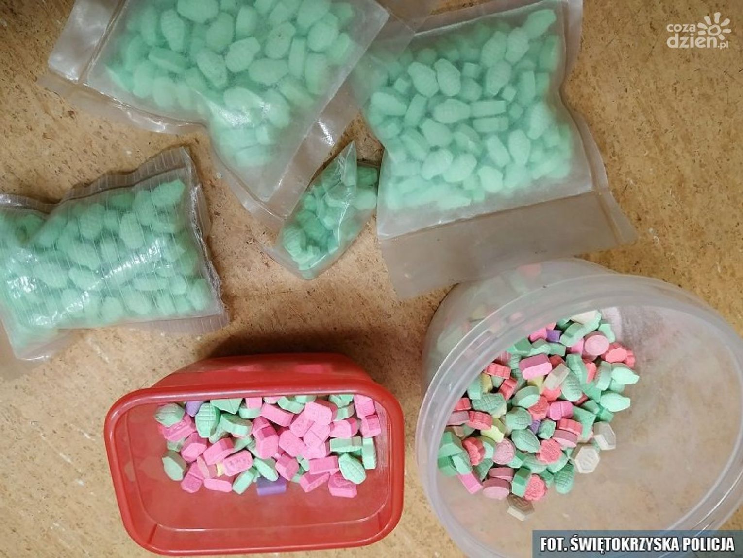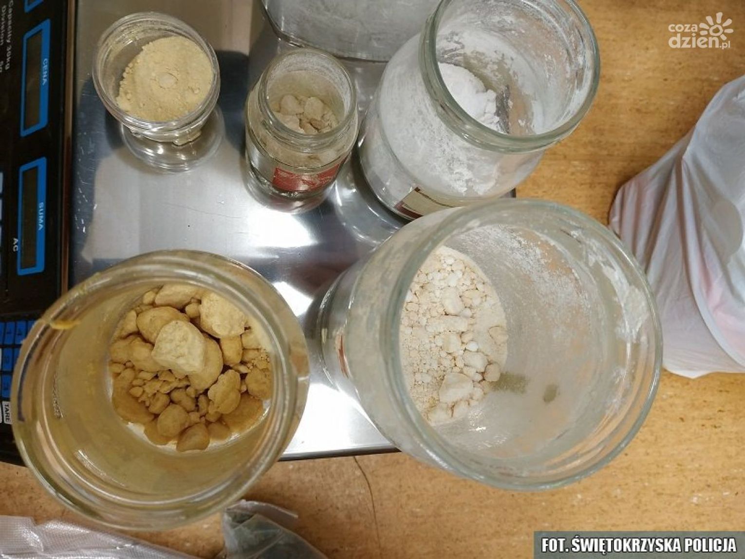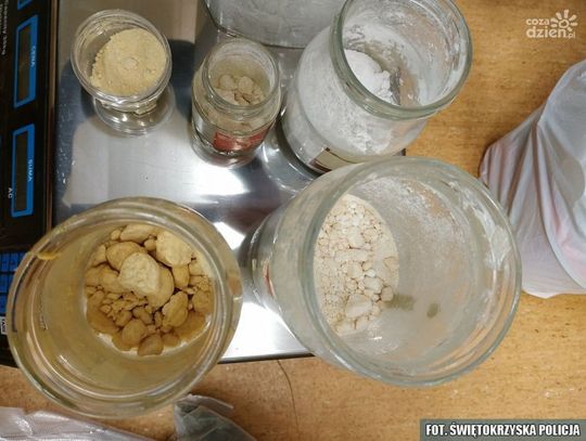 Policjanci z Wydziału Kryminalnego Komendy Powiatowej Policji w Ostrowcu Św. od pewnego czasu podejrzewali, że 48-letni mieszkaniec miasta może posiadać środki odurzające. W piątek, w godzinach popołudniowych w trakcie patrolu jednej z ulic funkcjonariusze napotkali 48-latka, który na ich widok zaczął się nienaturalnie nerwowo zachowywać. Policjanci przystąpili do przeszukania mężczyzny oraz samochodu, przy którym się znajdował. W trakcie tych czynności funkcjonariusze natrafili na kilka zawiniątek z zawartością suszu roślinnego i białego proszku oraz prawie 3 tysiące złotych w gotówce. W samochodzie natomiast znaleźli dwa naboje do karabinka sportowego, etui z wytrychami oraz cztery telefony komórkowe. Z ustaleń funkcjonariuszy wynikało, że mężczyzna może zamieszkiwać pod jednym z dwóch adresów, w związku z czym dokonano przeszukania w obu mieszkaniach. Jak się okazało, tam również 48-latek przechowywał znaczne ilości zabronionych substancji w postaci amfetaminy, marihuany, tabletek extasy i oleju konopnego oraz inne akcesoria służące do wyrabiania i przetwarzania substancji narkotycznych. W wyniku wszystkich czynności, łącznie zabezpieczono blisko kilogram amfetaminy, ponad 6 kg marihuany, ponad 800 tabletek extasy, a także 1,5 litra oleju konopnego oraz aparaturę do jego wytwarzania. Policjanci zabezpieczyli też cztery wagi elektroniczne, metalową kruszarkę, pojemnik z nasionami konopii, cztery telefony komórkowe, etui z zawartością wytrychów, dwie sztuki broni pneumatycznej, broń małokalibrową z celownikiem optycznym oraz 7 sztuk amunicji, broń białą typu nunczako i pieniądze.