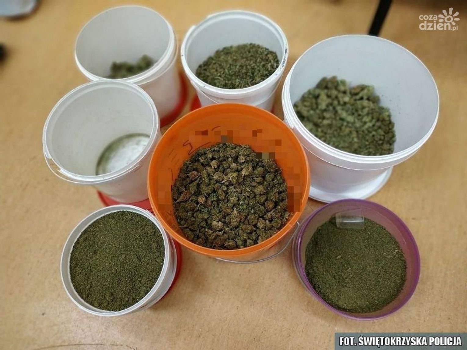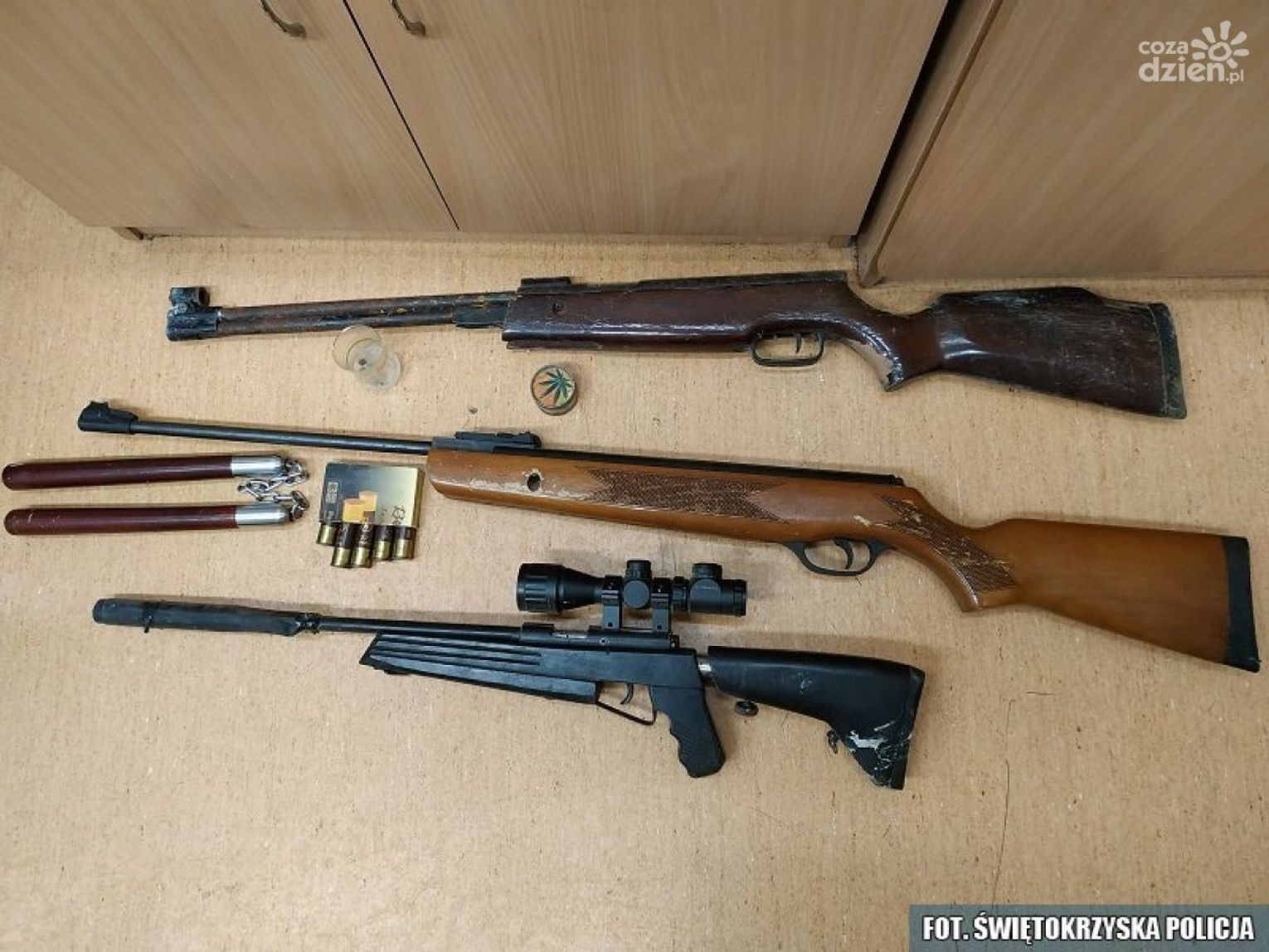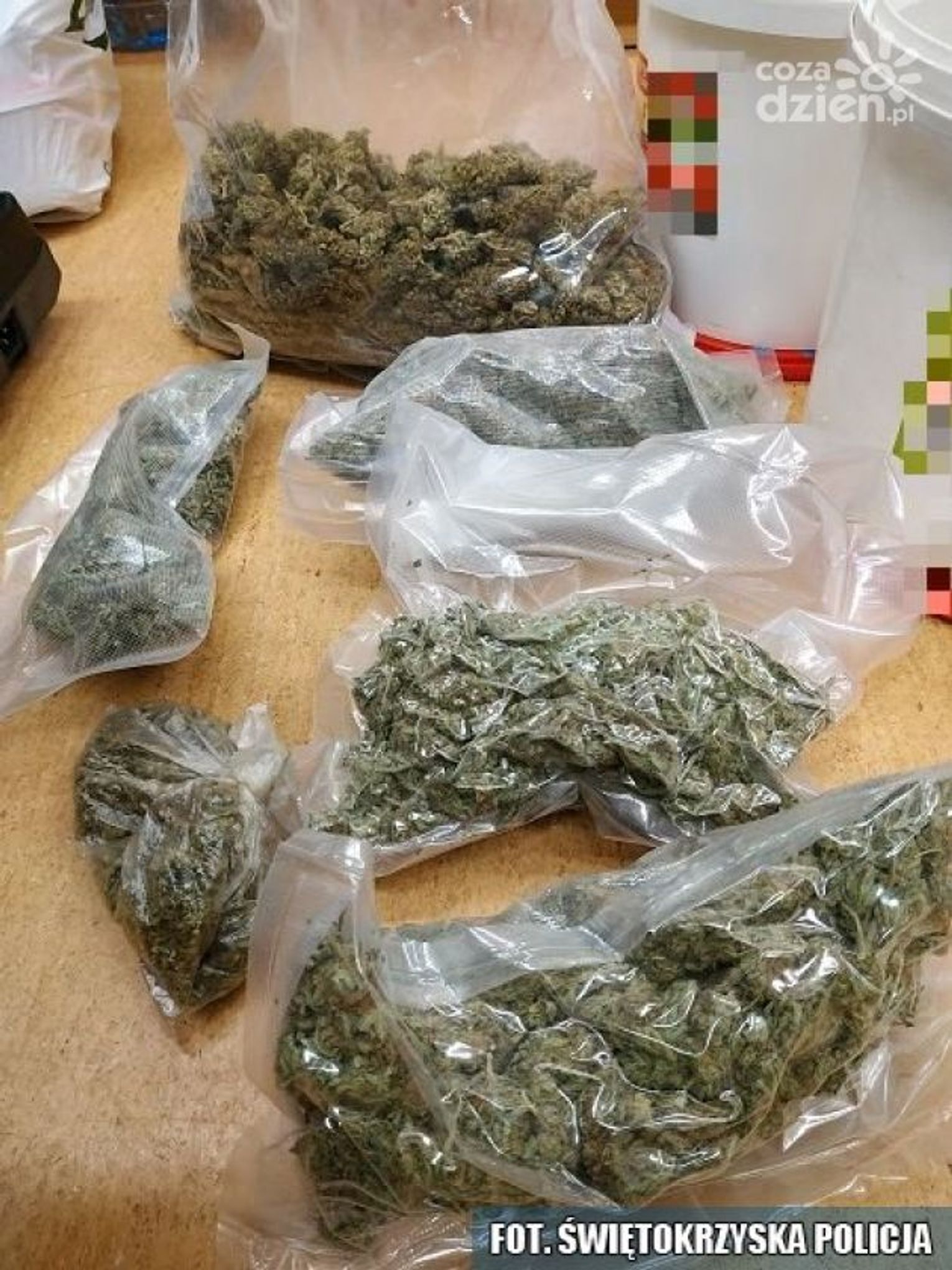 Policjanci z Wydziału Kryminalnego Komendy Powiatowej Policji w Ostrowcu Św. od pewnego czasu podejrzewali, że 48-letni mieszkaniec miasta może posiadać środki odurzające. W piątek, w godzinach popołudniowych w trakcie patrolu jednej z ulic funkcjonariusze napotkali 48-latka, który na ich widok zaczął się nienaturalnie nerwowo zachowywać. Policjanci przystąpili do przeszukania mężczyzny oraz samochodu, przy którym się znajdował. W trakcie tych czynności funkcjonariusze natrafili na kilka zawiniątek z zawartością suszu roślinnego i białego proszku oraz prawie 3 tysiące złotych w gotówce. W samochodzie natomiast znaleźli dwa naboje do karabinka sportowego, etui z wytrychami oraz cztery telefony komórkowe. Z ustaleń funkcjonariuszy wynikało, że mężczyzna może zamieszkiwać pod jednym z dwóch adresów, w związku z czym dokonano przeszukania w obu mieszkaniach. Jak się okazało, tam również 48-latek przechowywał znaczne ilości zabronionych substancji w postaci amfetaminy, marihuany, tabletek extasy i oleju konopnego oraz inne akcesoria służące do wyrabiania i przetwarzania substancji narkotycznych. W wyniku wszystkich czynności, łącznie zabezpieczono blisko kilogram amfetaminy, ponad 6 kg marihuany, ponad 800 tabletek extasy, a także 1,5 litra oleju konopnego oraz aparaturę do jego wytwarzania. Policjanci zabezpieczyli też cztery wagi elektroniczne, metalową kruszarkę, pojemnik z nasionami konopii, cztery telefony komórkowe, etui z zawartością wytrychów, dwie sztuki broni pneumatycznej, broń małokalibrową z celownikiem optycznym oraz 7 sztuk amunicji, broń białą typu nunczako i pieniądze.
