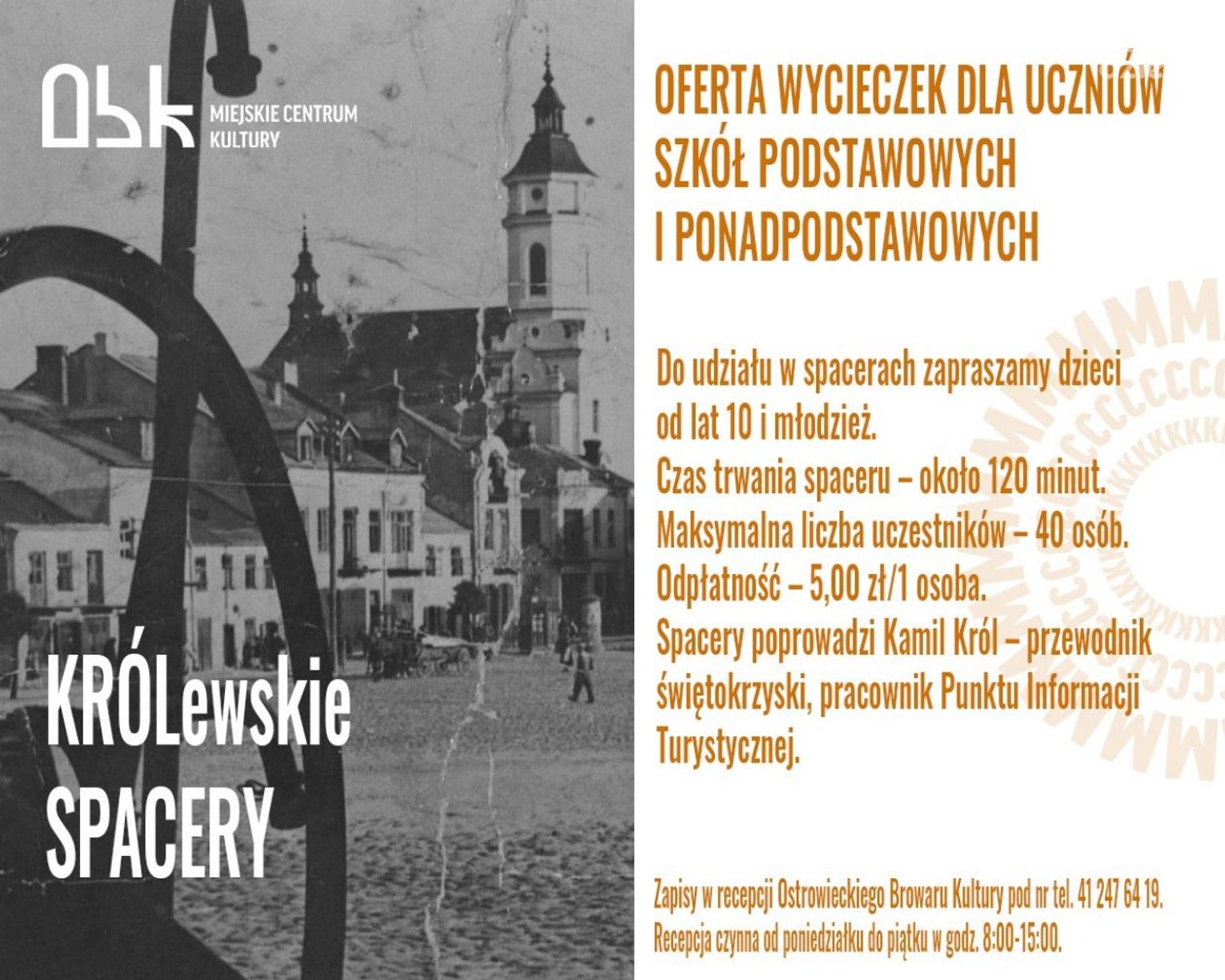 KRÓLewskie spacery rozpoczną się 6 maja od zapoznania się z legendarnymi i historycznymi początkami Ostrowca, dlatego uczestnicy przejdą przez Rynek i śródmieście. W kolejnych terminach, a w maju spacery będą odbywały się w każdy poniedziałek uczestnicy zwiedzą osadę fabryczną Klimkiewiczów, poznają epizody Powstania Styczniowego w rejonie Ostrowca i poznają osadę fabryczną Cukrownia w Częstociacach.