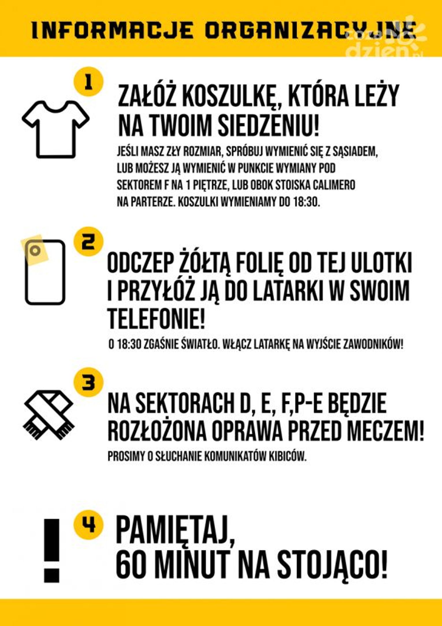 - dla kibiców przygotowane zostaną okazjonalne żółte koszulki. Prosimy, by je założyć, stworzymy tym samym jednolitą żółtą ścianę fanów. Jeżeli rozmiar nie będzie odpowiedni, zachęcamy, by najpierw spróbować wymienić się z jednym z sąsiadów. Jeżeli to nie będzie możliwe, można udać się do jednego z punktów wymiany t-shirtów, które znajdować się będą na końcu korytarza pod sektorem F oraz na parterze w pobliżu stoiska Calimero Cafe.