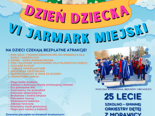 Jest więc mini golf, dmuchana zjeżdżalnia, góra wspinaczkowa i liczne zabawy z animatorami to przede wszystkim dla dzieci. Dla rodziców jest choćby jubileuszowy koncert orkiestr dętych z Morawicy, Zabierzowa i Krapkowic. Po koncercie zespoły przejdą w uroczystym przemarszu przez zabytkowy Park Dworski w Morawicy. To wydarzenie odbywa się z okazji obchodów 25- lecia Szkolno-Gminnej Orkiestry Dętej z Morawicy