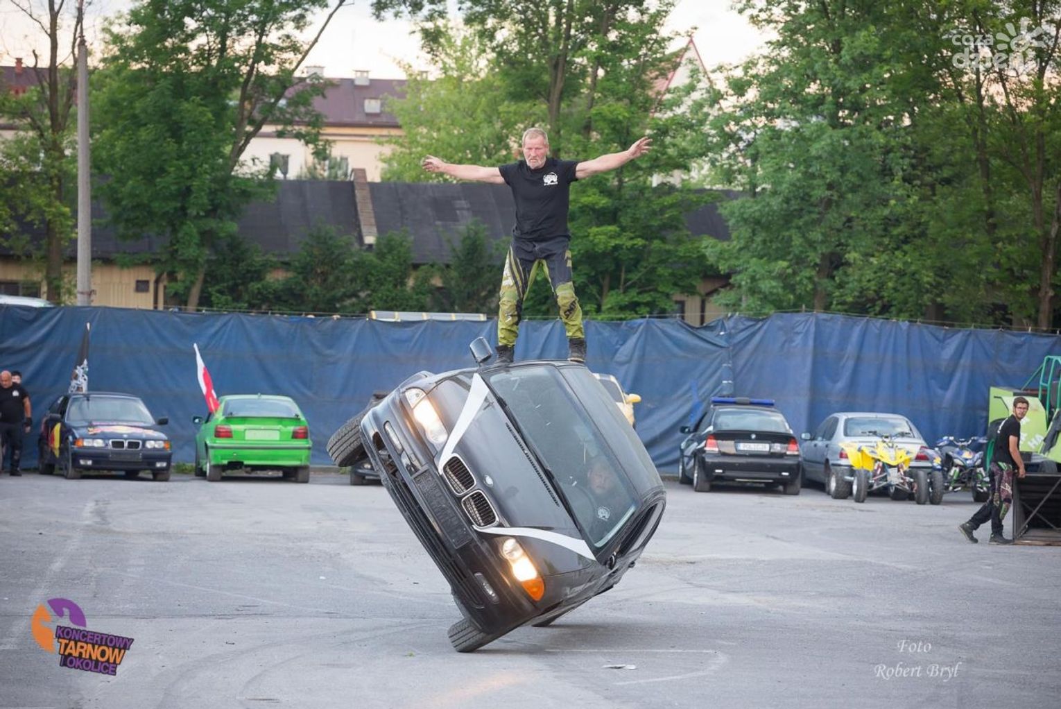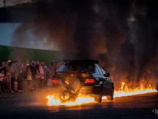 - przejazdy przez ścianę ognia z człowiekiem na masce,