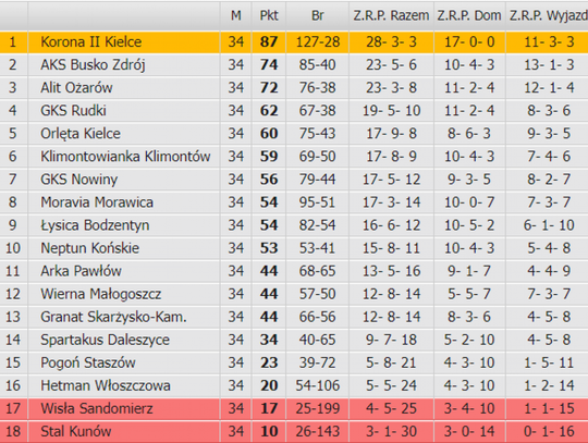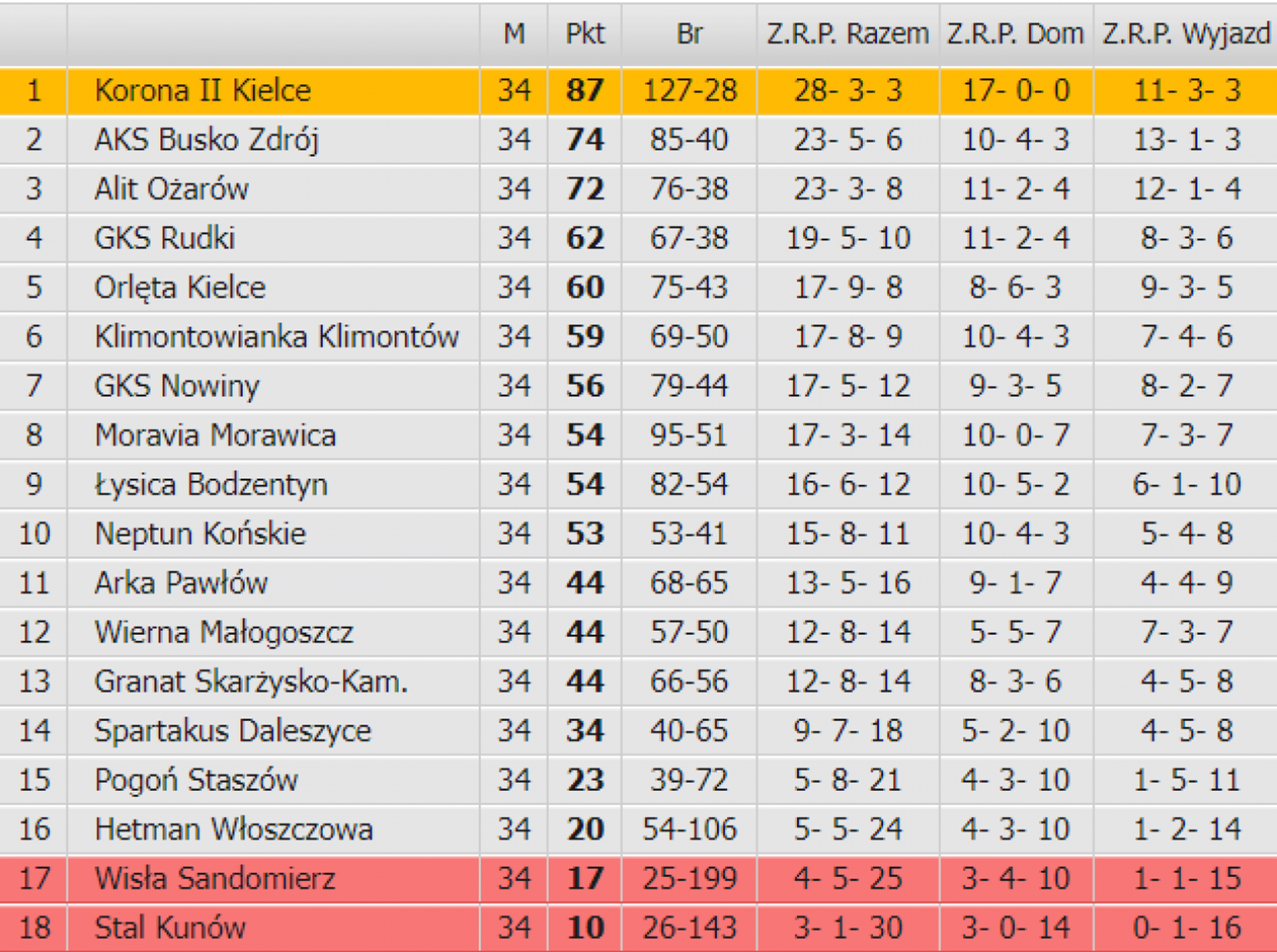 Z ligi spadły dwie ekipy. Stal Kunów, tylko albo aż 10 punktów jakie udało im się zdobyć wyraźnie wskazują, że byli outsiderem. 26 bramek tylko trafionych i aż 143 gole stracone co daje nam bilans na poziomie -117. Kosmicznie słaby wynik nawet jak na realia IV ligi. Wisła Sandomierz to drugi ze spadkowiczów. Prawie 200 goli straconych przy 25 strzelonych. Tak słabej defensywy nie było od lat w polskim futbolu.
