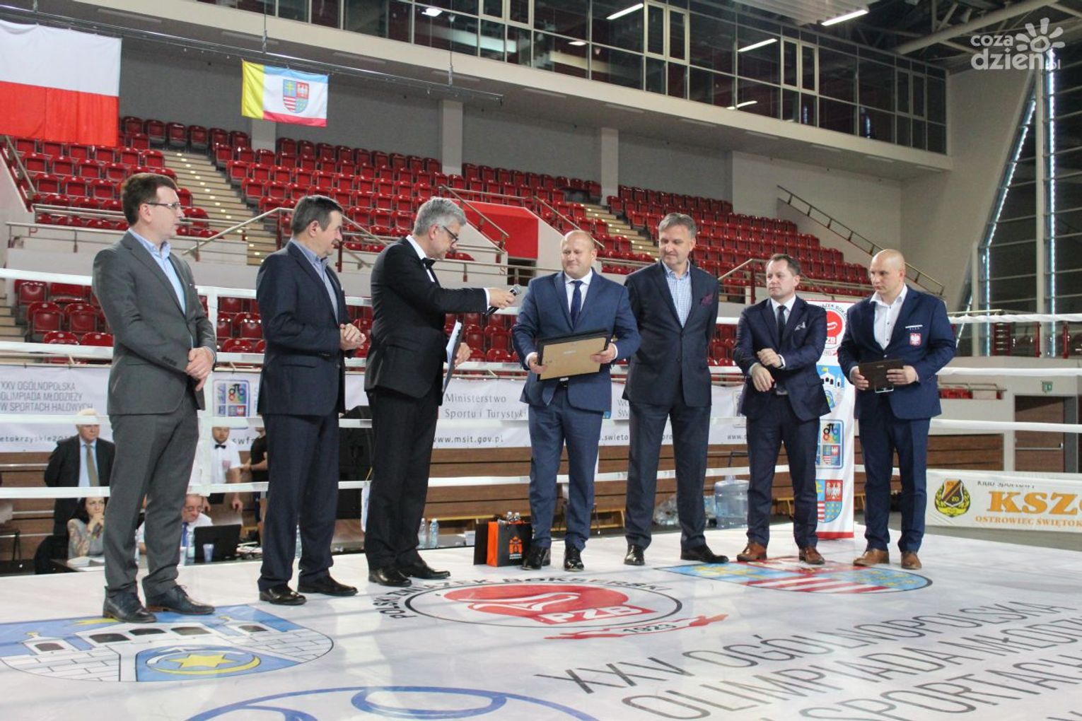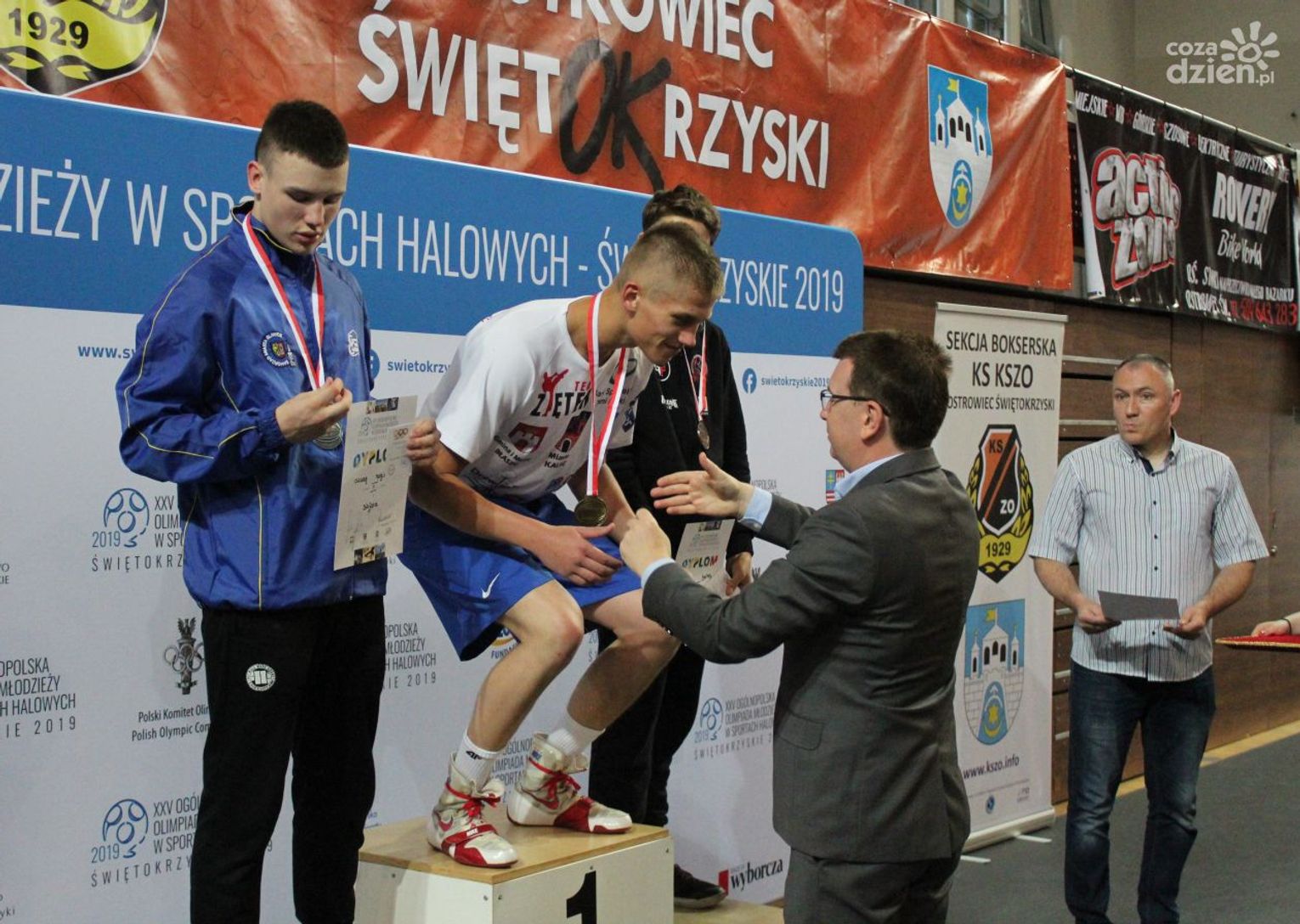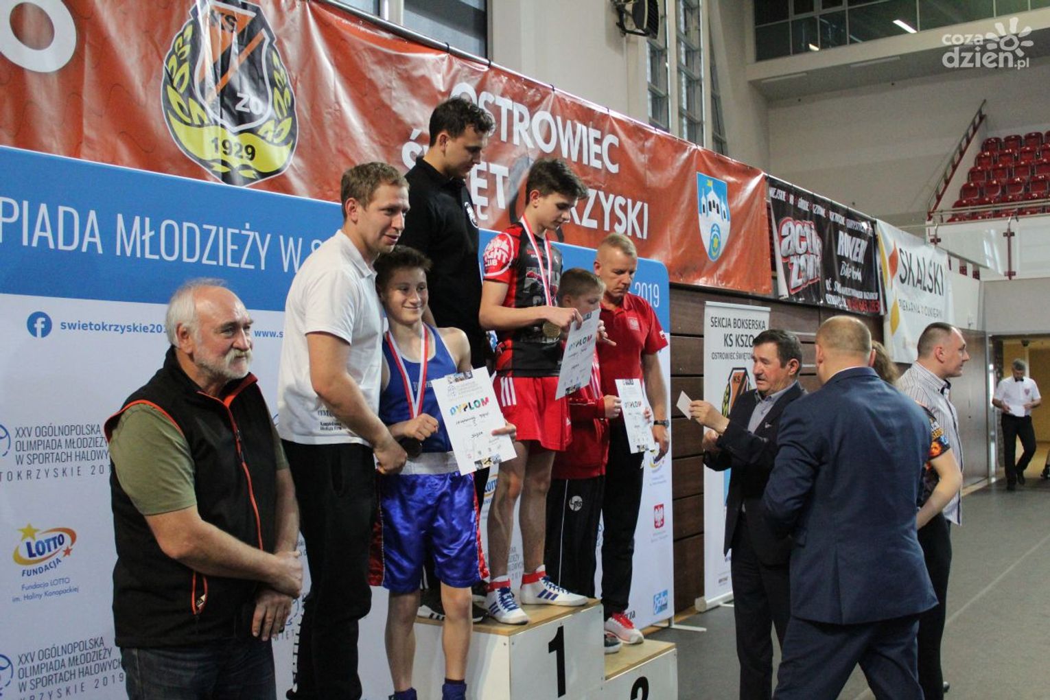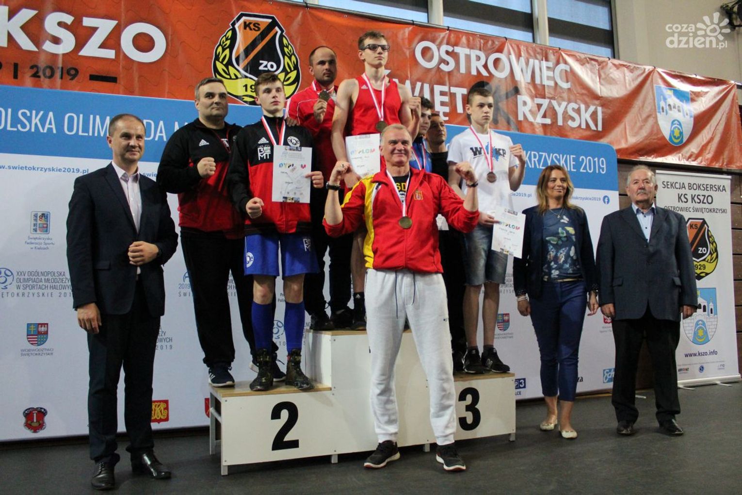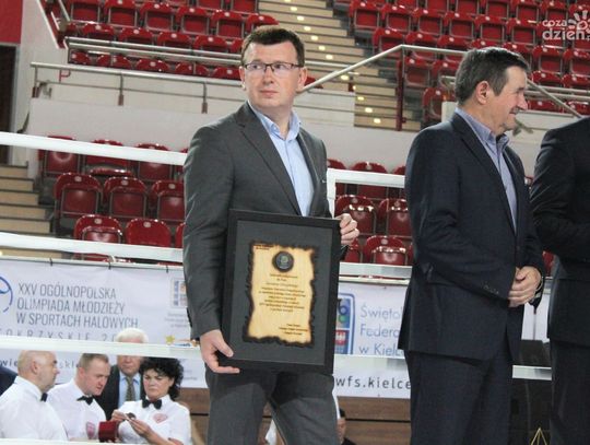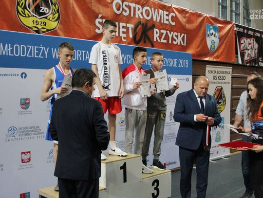 Na rozgrywanych w Ostrowcu zawodach wzięło udział ponad 150 zawodników z całej Polski, niedziela była ostatnim dniem wydarzenia i zarówno ostatnim dniem rozgrywanej od początku kwietnia na świętokrzyskiej ziemi XXV Ogólnopolskiej Olimpiady Młodzieży w sportach halowych. Podczas uroczystego zakończenia na hali przy Świętokrzyskiej gościliśmy min. Grzegorza Nowaczka prezesa Polskiego Związku Bokserskiego, Jacka Kowalczyka z Departamentu Sportu i Turystyki Świętokrzyskiego Urzędu Marszałkowskiego oraz prezydenta Ostrowca Świętokrzyskiego Jarosława Górczyńskiego. Uroczystość była również doskonałą okazją do uhonorowania okolicznościowym medalem Polskiego Związku Bokserskiego trenera pięściarzy KSZO Eugeniusza Ciocha, który w tym roku obchodzi jubileusz 40 - lecia pracy na rzecz świętokrzyskiego pięściarstwa.