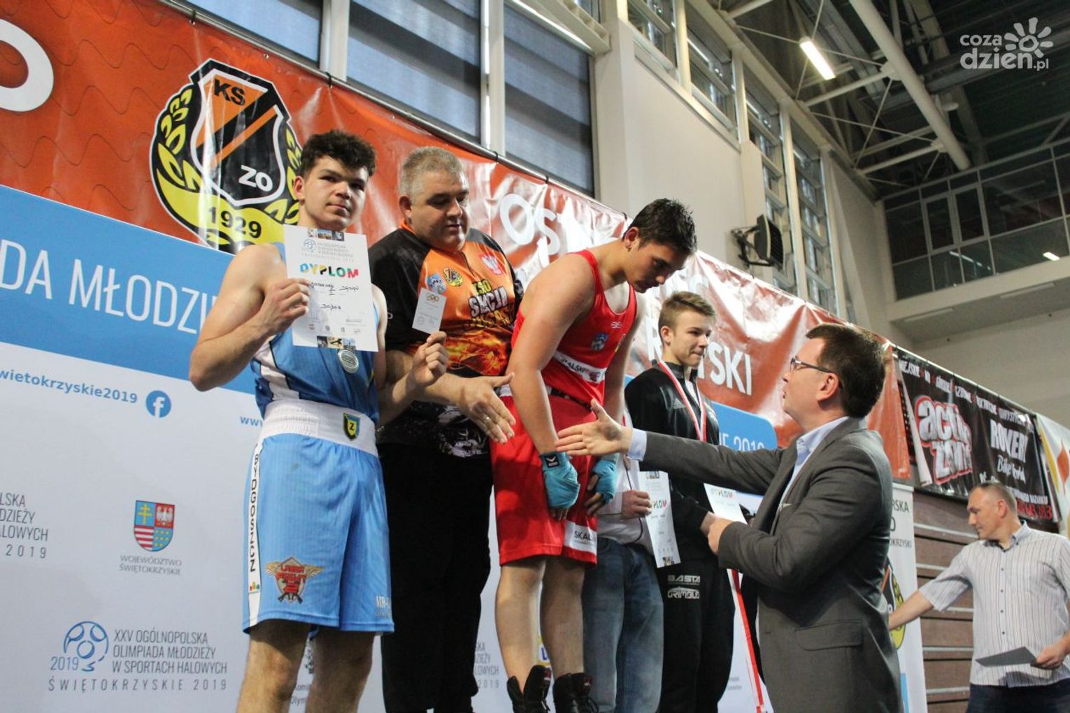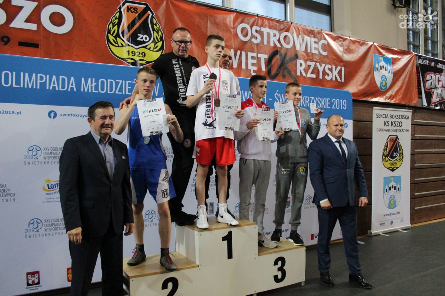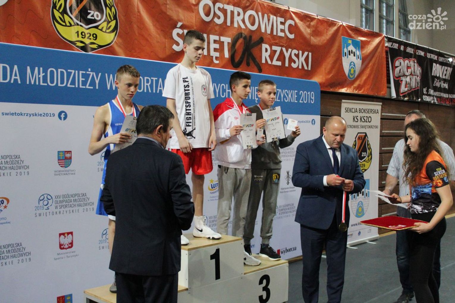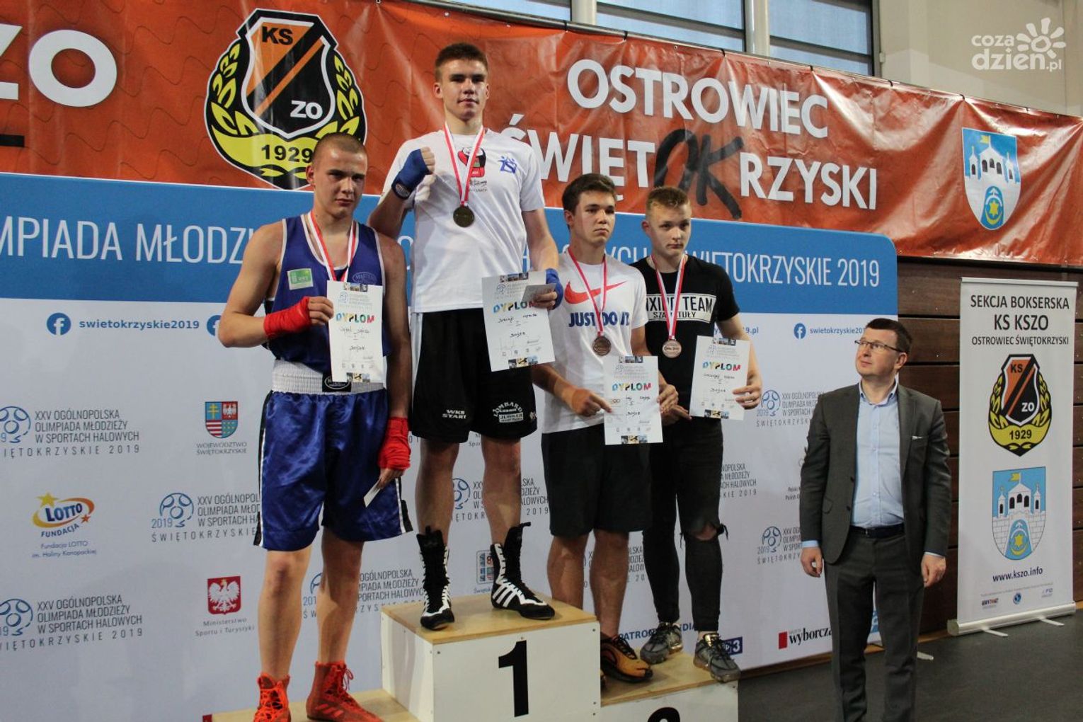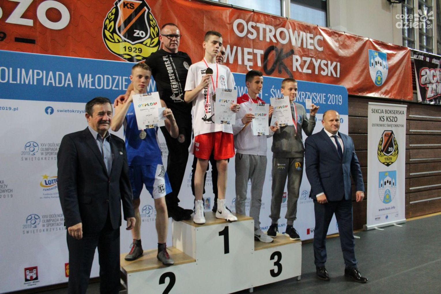 Na rozgrywanych w Ostrowcu zawodach wzięło udział ponad 150 zawodników z całej Polski, niedziela była ostatnim dniem wydarzenia i zarówno ostatnim dniem rozgrywanej od początku kwietnia na świętokrzyskiej ziemi XXV Ogólnopolskiej Olimpiady Młodzieży w sportach halowych. Podczas uroczystego zakończenia na hali przy Świętokrzyskiej gościliśmy min. Grzegorza Nowaczka prezesa Polskiego Związku Bokserskiego, Jacka Kowalczyka z Departamentu Sportu i Turystyki Świętokrzyskiego Urzędu Marszałkowskiego oraz prezydenta Ostrowca Świętokrzyskiego Jarosława Górczyńskiego. Uroczystość była również doskonałą okazją do uhonorowania okolicznościowym medalem Polskiego Związku Bokserskiego trenera pięściarzy KSZO Eugeniusza Ciocha, który w tym roku obchodzi jubileusz 40 - lecia pracy na rzecz świętokrzyskiego pięściarstwa.