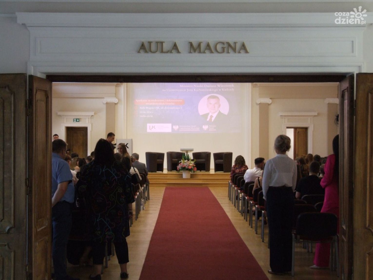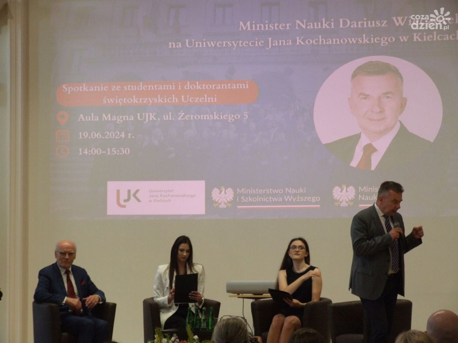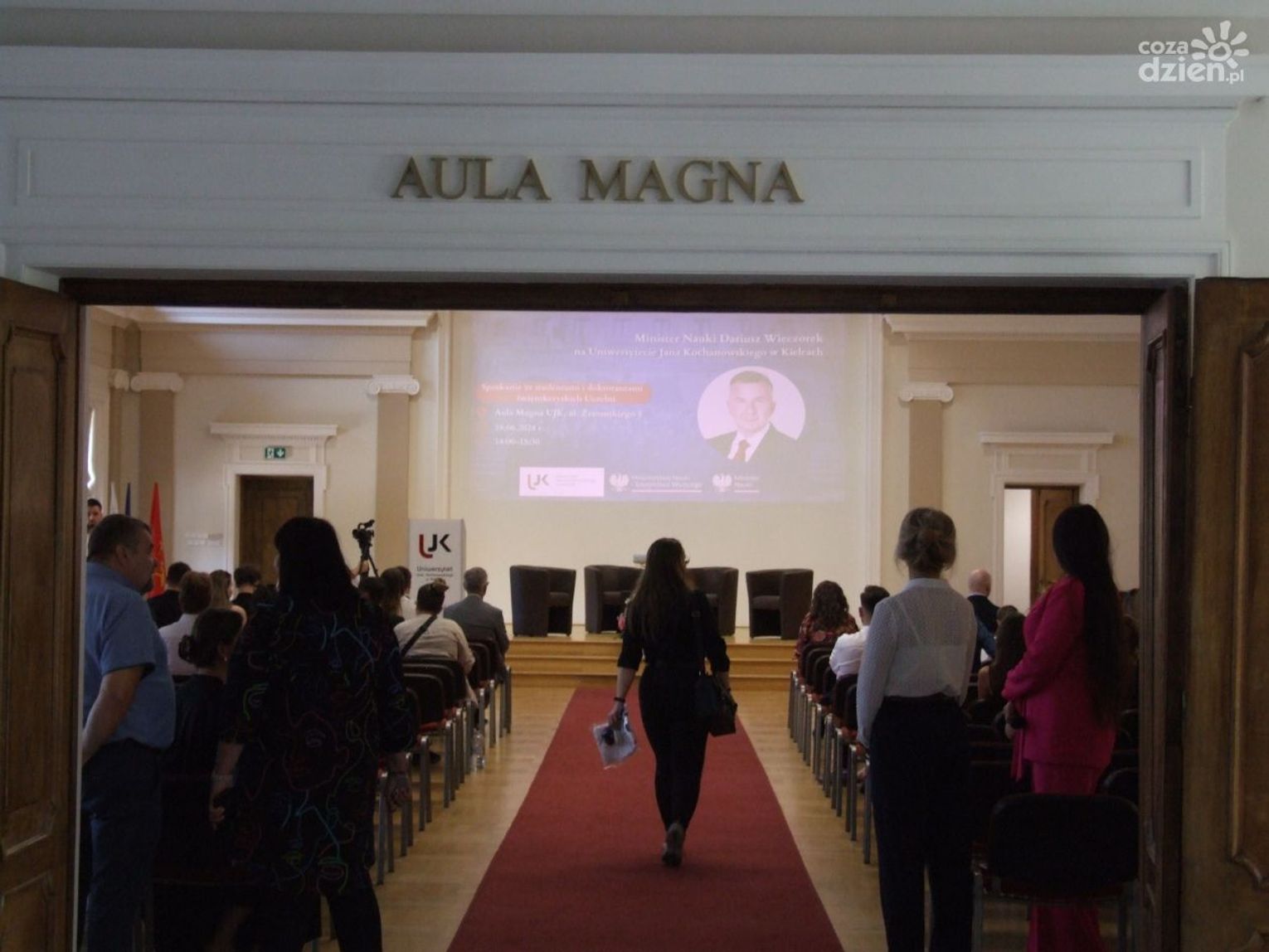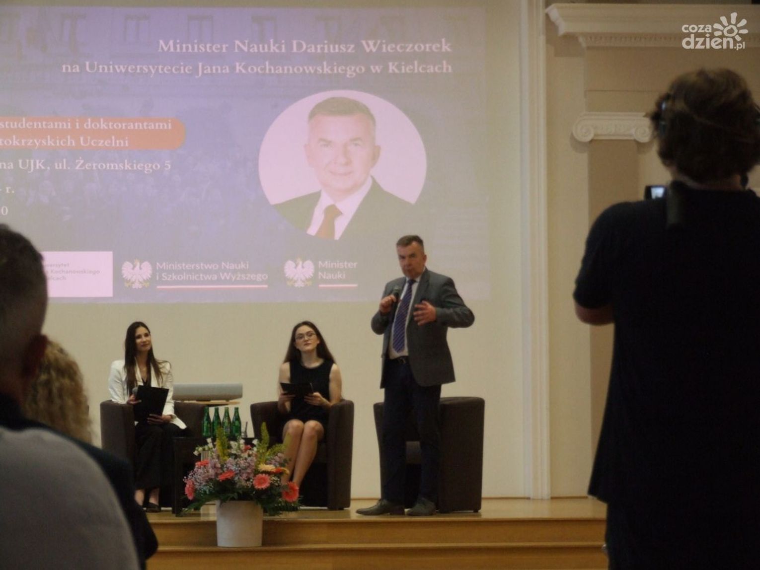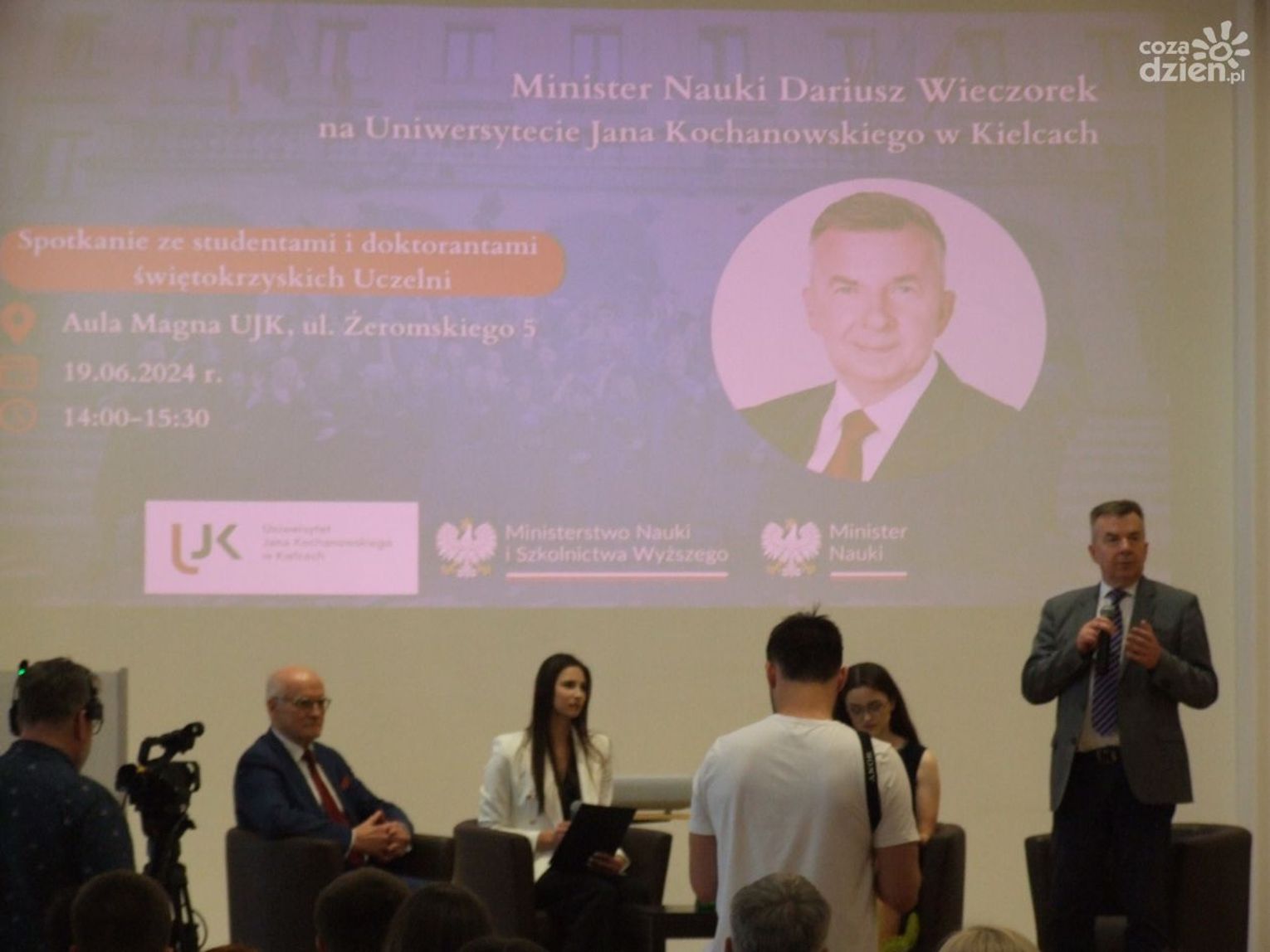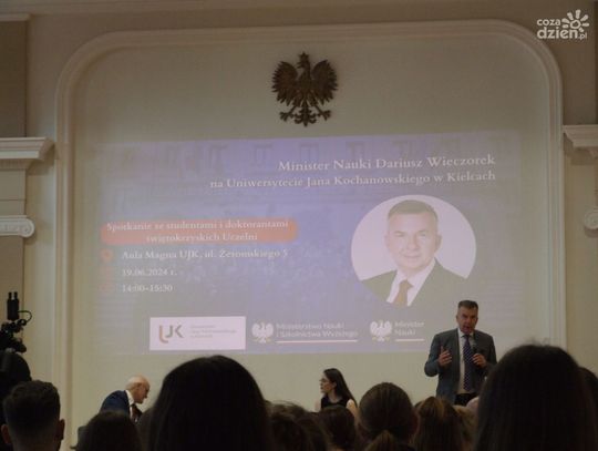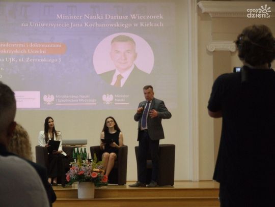 W środę 19 czerwca na Uniwersytecie Jana Kochanowskiego w Kielcach pojawił się minister Nauki i Szkolnictwa Wyższego - Dariusz Wieczorek. Odbył on spotkania z władzami uczelni, a następnie w południe miał miejsce briefing prasowy. O godzinie 14 w Auli Magna Rektoratu UJK odbyło się specjalne spotkanie z ministrem poprowadzone przez studentki uniwersytetu. Pytania mogli zadawać doktoranci i studenci wszystkich świętokrzyskich uczelni.