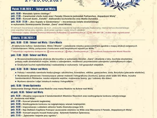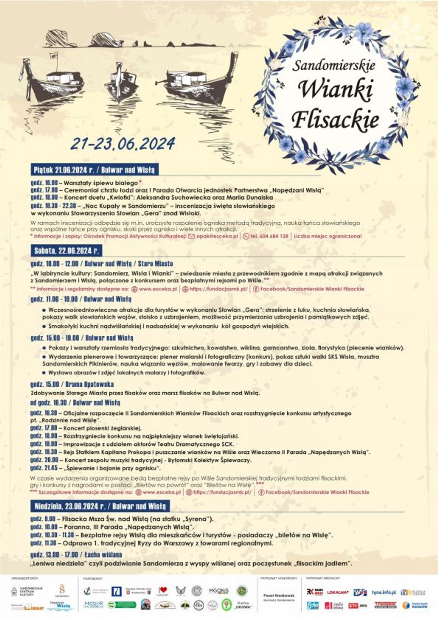 Tegoroczne Sandomierskie Wianki Flisackie będą trwać do niedzieli, 23 czerwca. Wydarzenie obfituje w szereg ciekawych i różnorodnych działań, takich jak rejsy, warsztaty, prezentacje, paradę, spotkania muzyczne, stoiska wytwórców sztuki ludowej i kół gospodyń wiejskich, ognisko i inne. A wszystkie oscylują wokół Wisły - królowej polskich rzek i sandomierskich tradycji flisackich oraz tych staropolskich związanych z Nocą Świętojańską i zielarstwem.