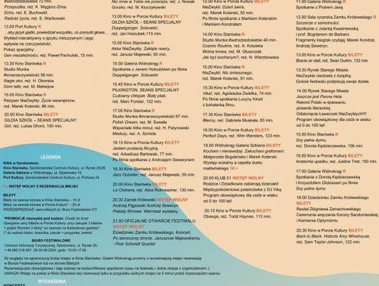 W programie tego trwającego do niedzieli włącznie wydarzenia organizatorzy zaplanowali mnóstwo projekcji filmowych, spotkań z aktorami i reżyserami, koncertów ale i innych atrakcji. Będzie więc odsłona kolejnej filmowej ławeczki na sandomierskiej starówce, bicie rekordu Polski w śpiewaniu piosenki literackiej oraz warsztaty filmowe.