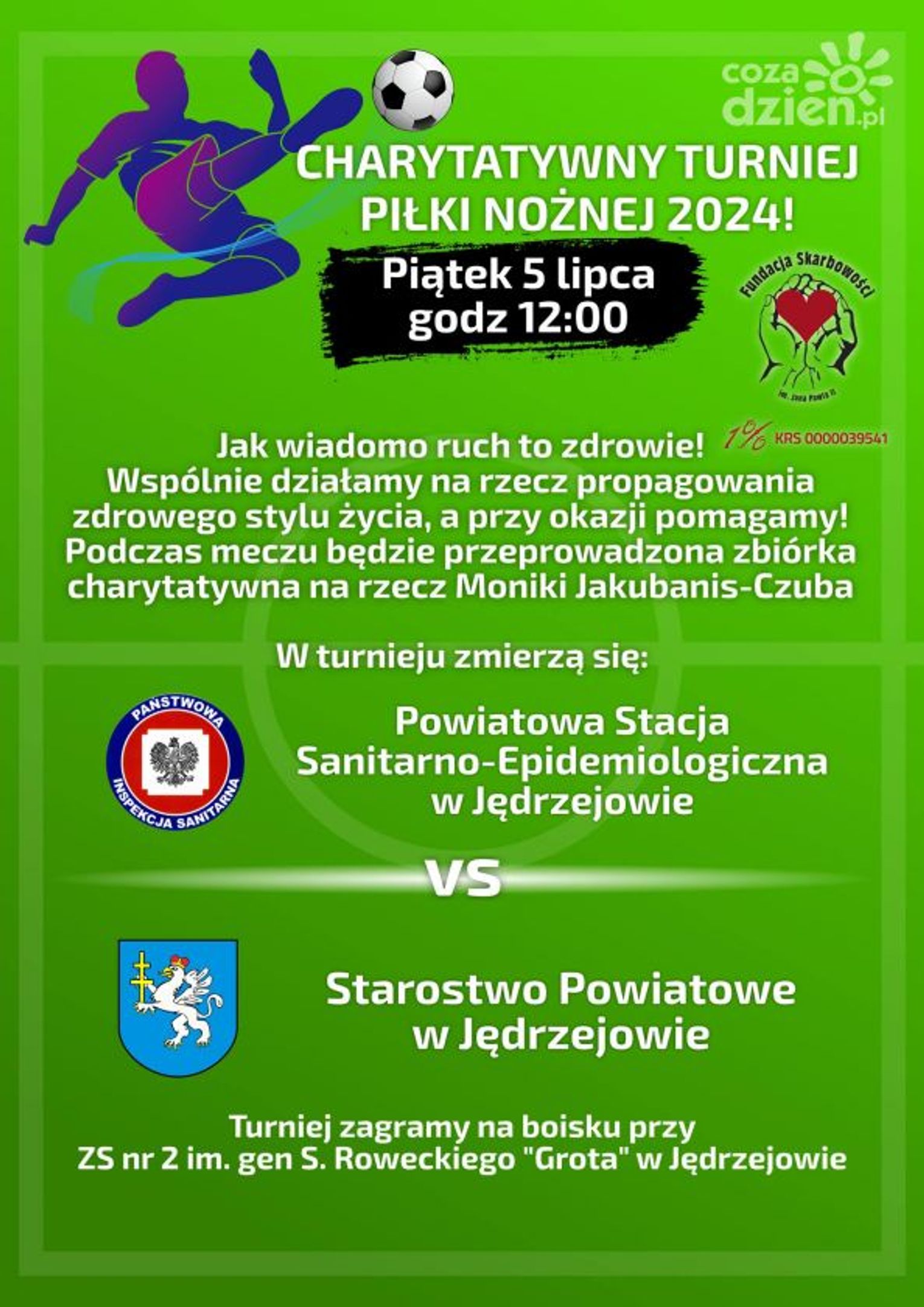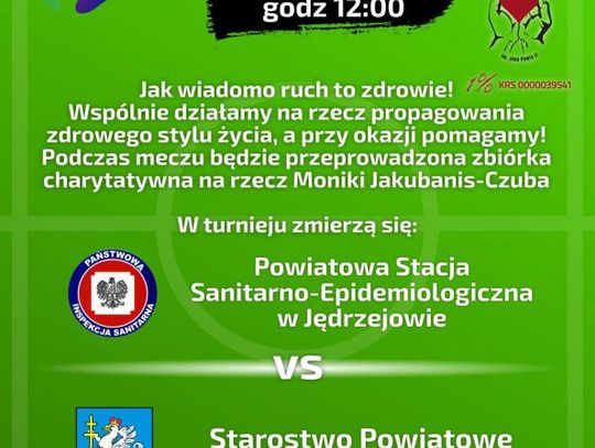 5 lipca na boisku przy Zespole Szkół nr 2 im. gen S. Roweckiego "Grota" w Jędrzejowie odbędzie się charytatywny turniej w piłkę nożną. O puchar rywalizować będą dwa zespoły - drużyna Powiatowej Stacji Sanitarno-Epidemiologicznej w Jędrzejowie oraz Starostwo Powiatowe Jędrzejów.