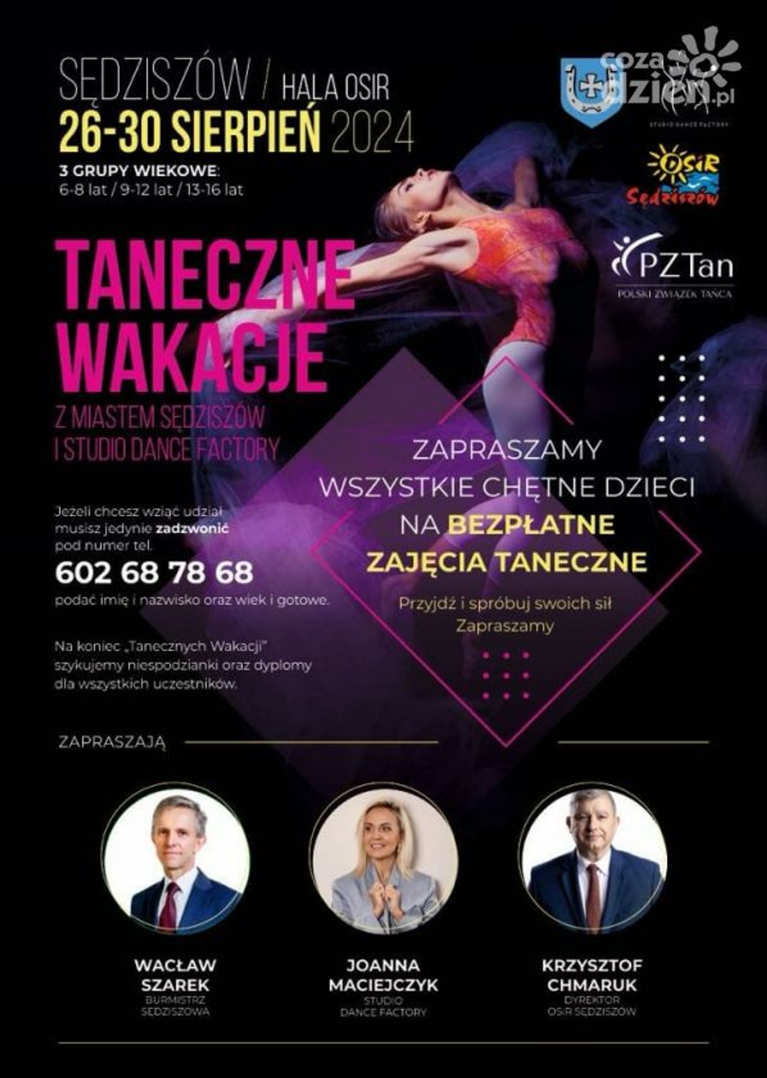 W Sędziszowie odbędą się "Taneczne wakacje z miastem Sędziszów i Studiem Dance Factory". Uczestnicy zostaną podzieleni na 3 grupy wiekowe od 6 do 8 lat, od 9 do 12 lat oraz od 13 do 16 lat. Wydarzenie będzie trwało w dniach 26-30 sierpnia w hali OSiR w Sędziszowie.