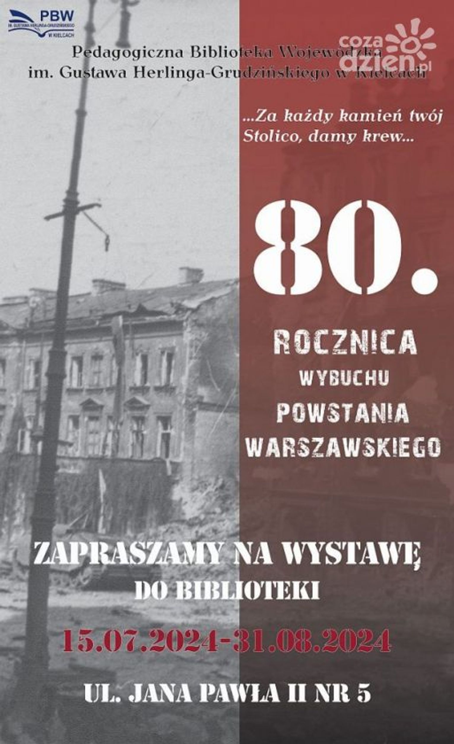 W 80. rocznicę wybuchu Powstania Warszawskiego, 1 sierpnia 2024 o godz. 11 w siedzibie Pedagogicznej Biblioteki Wojewódzkiej im. Gustawa Herlinga-Grudzińskiego w Kielcach zostanie otwarta wystawa „Za każdy kamień Twój, Stolico, damy krew”.