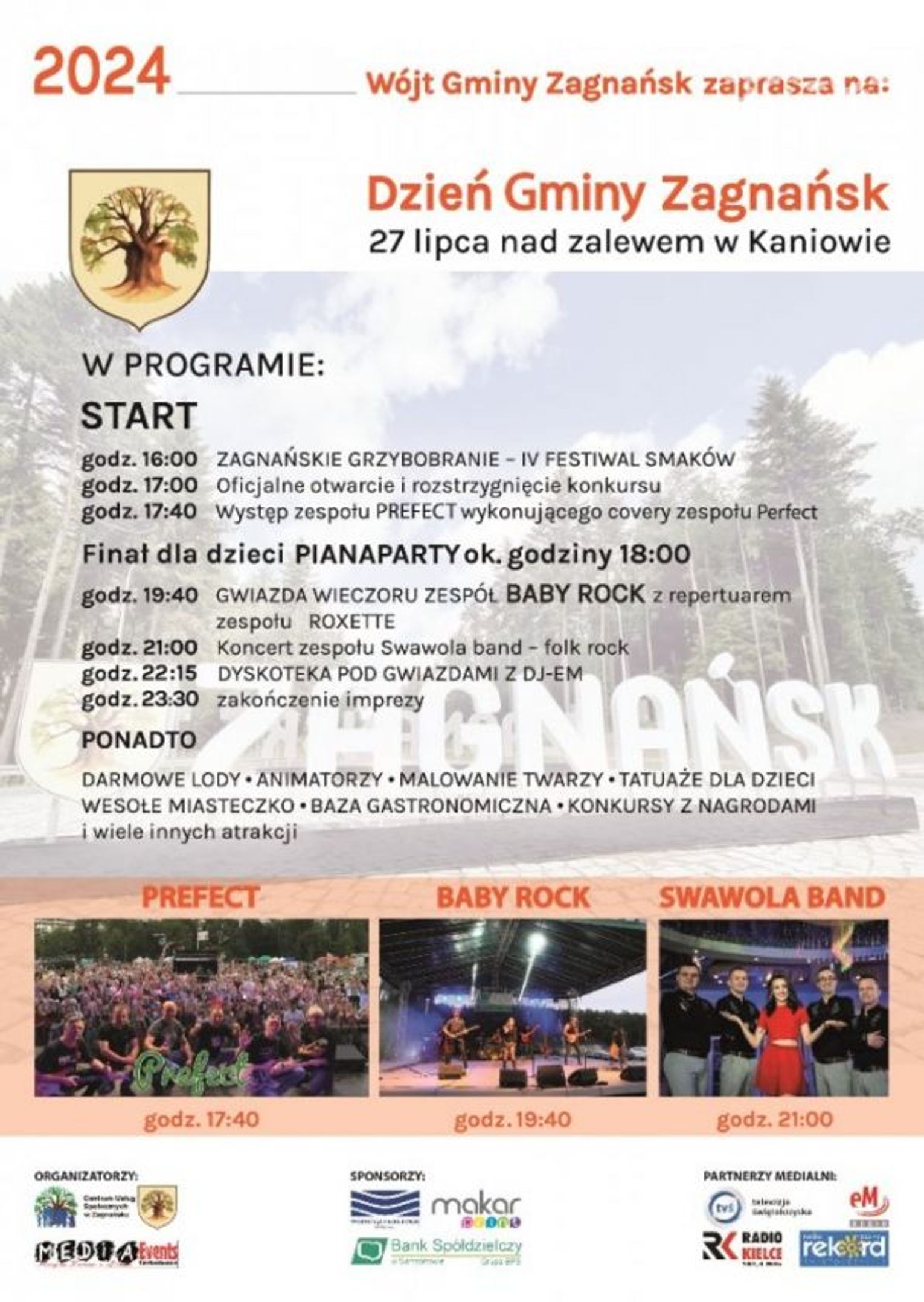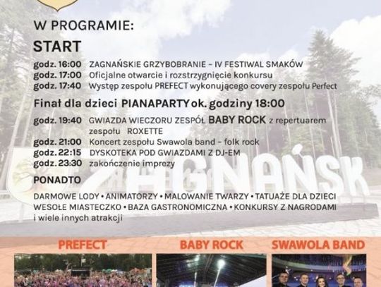 Start planowany jest na godzinę 16.00. Rozpocznie go tzw. Zagnańskie Grzybobranie, czyli IV Festiwal Smaku. Nie zabraknie także gwiazd muzyki. Gwiazdą wieczoru będzie zespół BABY ROCK, który zaprezentuję repertuar legendarnego Roxette.