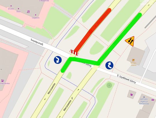 Na skrzyżowaniu z ul. Turystyczną wyłączona zostanie sygnalizacja świetlna. Wyjazd na ul. Warszawską z ul. Turystycznej i Szydłówek Górny możliwy będzie wyłącznie w prawo. Wyłączone zostaną relacje na wprost oraz w lewo. Objazd do ul. Szydłówek Górny możliwy będzie poprzez zawracanie na skrzyżowaniu ul. Warszawskiej z ul. Starą.