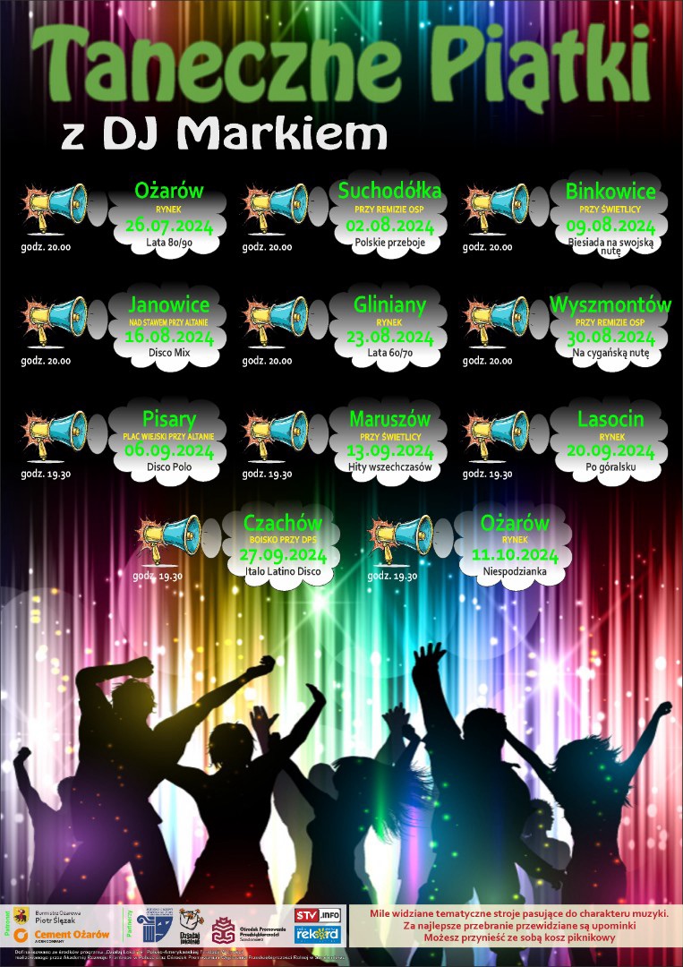 A poniżej na plakacie rozpiska w jakich miejscach odbędą się kolejne "Taneczne Piątki" w gminie Ożarów.