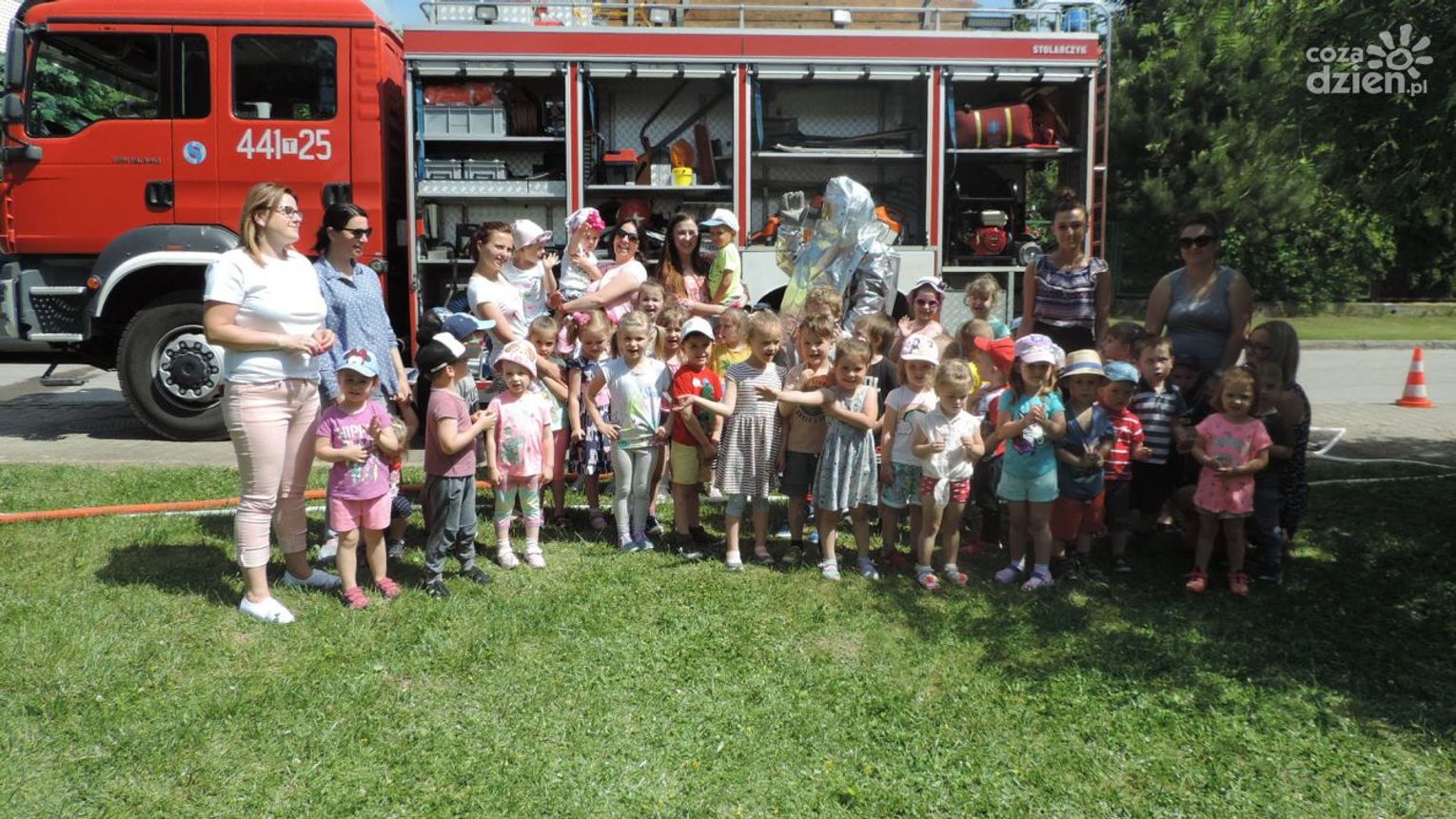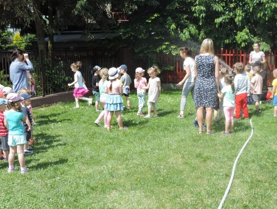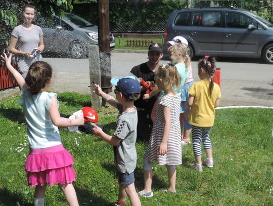 W związku ze zbliżającym się okresem wakacyjnym omówiono zasady bezpiecznego wypoczynku między innymi na akwenach wodnych oraz w górach. Przypomniane zostały również numery alarmowe oraz sposób poprawnego wzywania służb ratunkowych, a także podstawowe zagadnienia dotyczące udzielania pierwszej pomocy osobom poszkodowanym. Największą atrakcją dla maluchów okazał się pokaz sprzętu strażackiego znajdującego się na wyposażeniu samochodu. W tak upalny dzień dużą radość dzieciom sprawiło podanie strumienia wody ze „strażackiej sikawki” do wyznaczonego celu. Dzieci w ramach podziękowania za przeprowadzony pokaz odznaczyli strażaków medalami „przyjaciół przedszkola”.