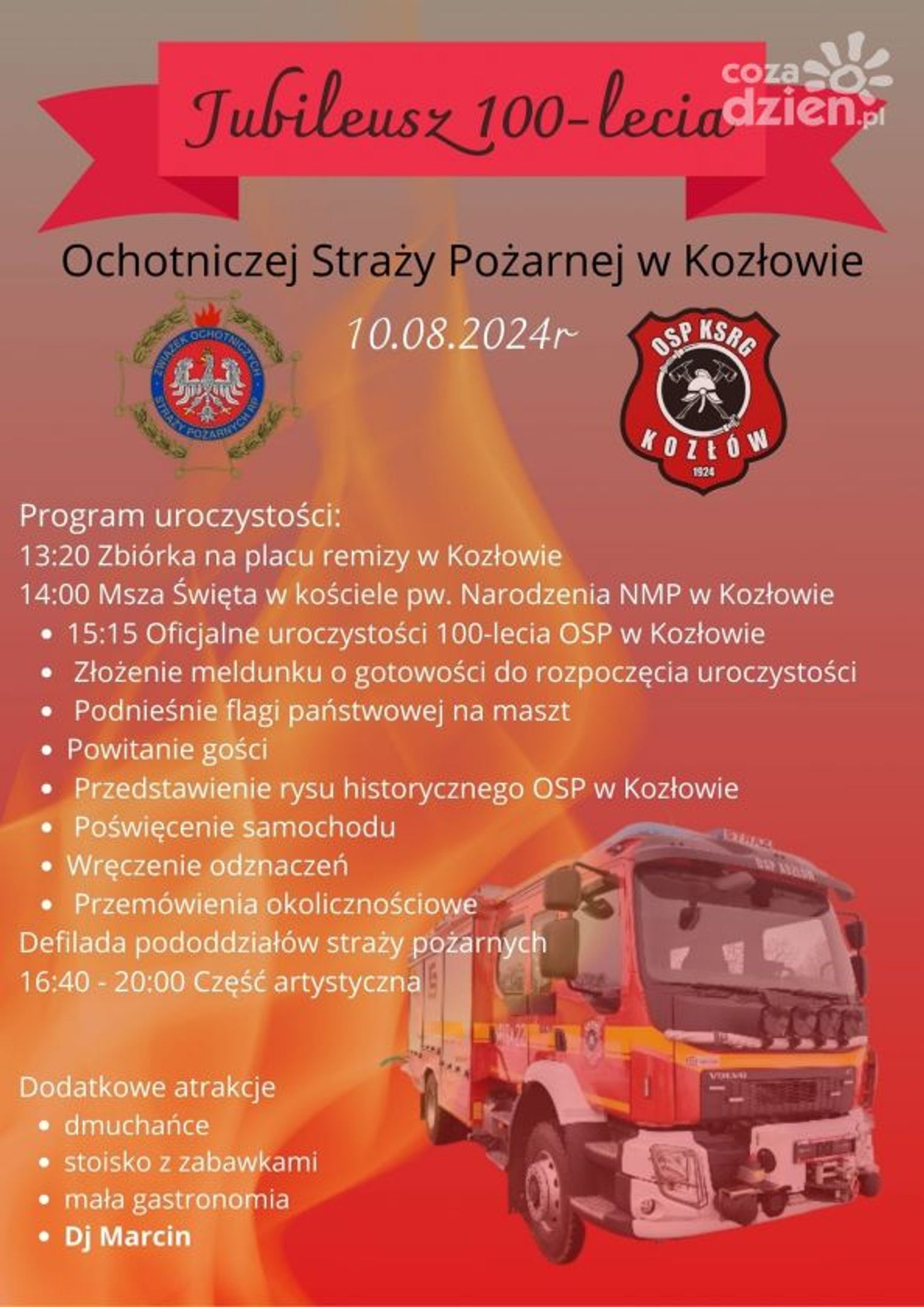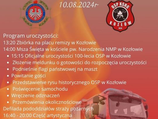 Wydarzenie rozpocznie się o godzinie 13:20. Wtedy to będzie miała zbiórka pod remizą w Kozłowie. Następnie o godzinie 14:00 odprawiona zostanie Msza Święta w kościele pod wezwaniem Narodzenia Najświętszej Maryi Panny. Po kwestiach sakralnych nastąpi oficjalne rozpoczęcie uroczystości 100-lecia OSP Kozłów.