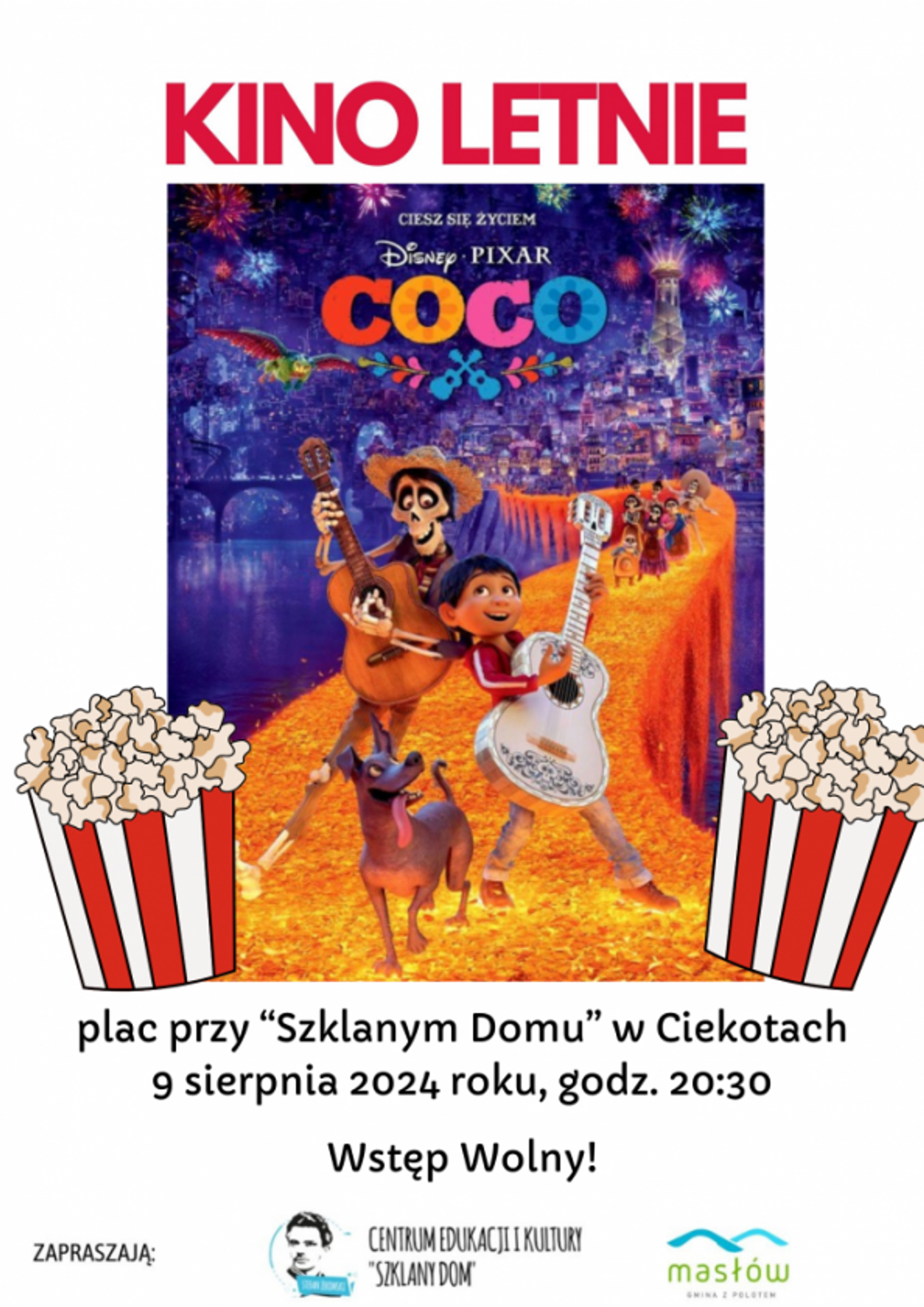 W piątek 9 sierpnia rozpocznie się kolejny seans w ramach letniego kina. Seans odbędzie się przed Centrum Edukacji i Kultury "Szklany Dom". Tym razem będzie możliwość obejrzenia animacji amerykańskiej wytwórni Disney- ,,Coco". Początek planowany jest na 20.30.