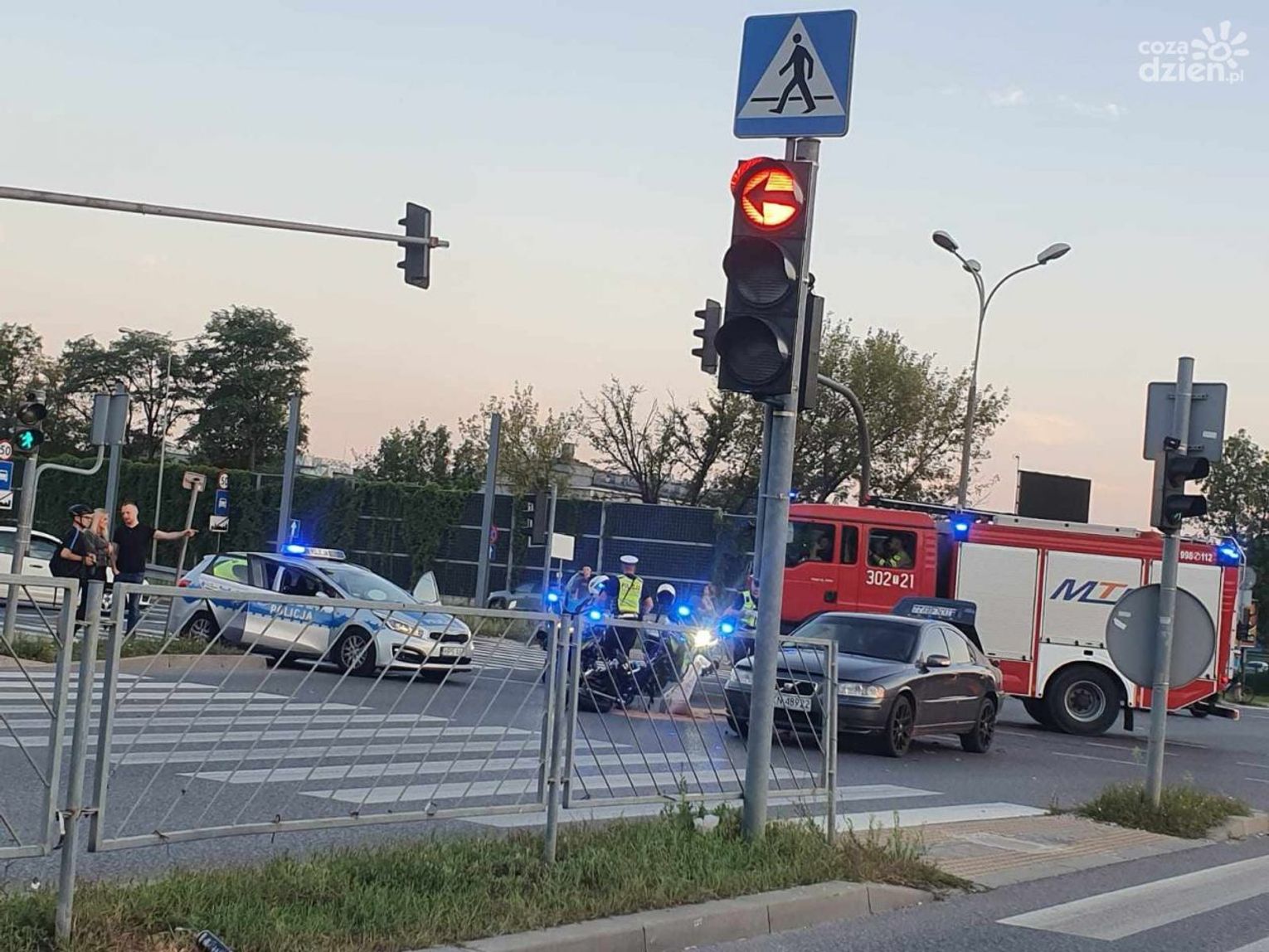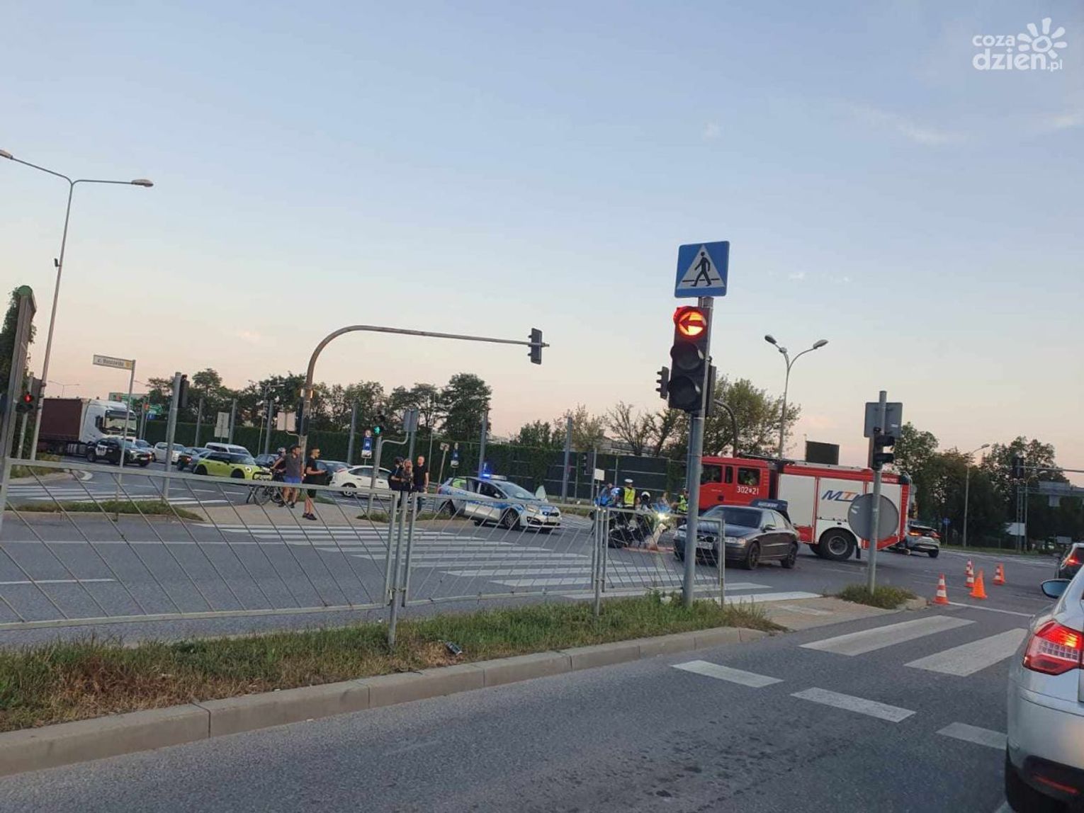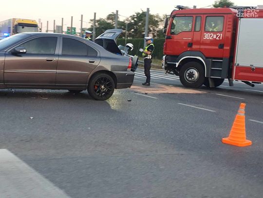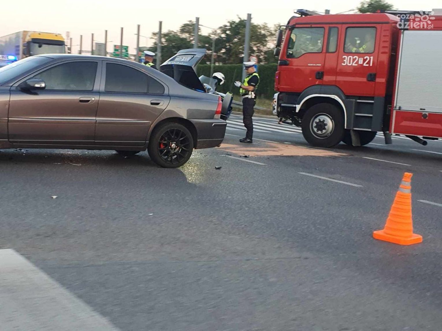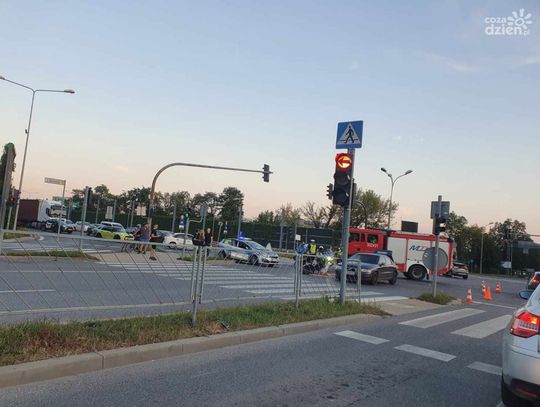 Jak mówią policjanci, obaj poszkodowani byli trzeźwi. Motocyklista został przewieziony do szpitala. W tym czasie na miejscu pozostały między innymi dwa samochody strażackie. Policjant kieruje ruchem.