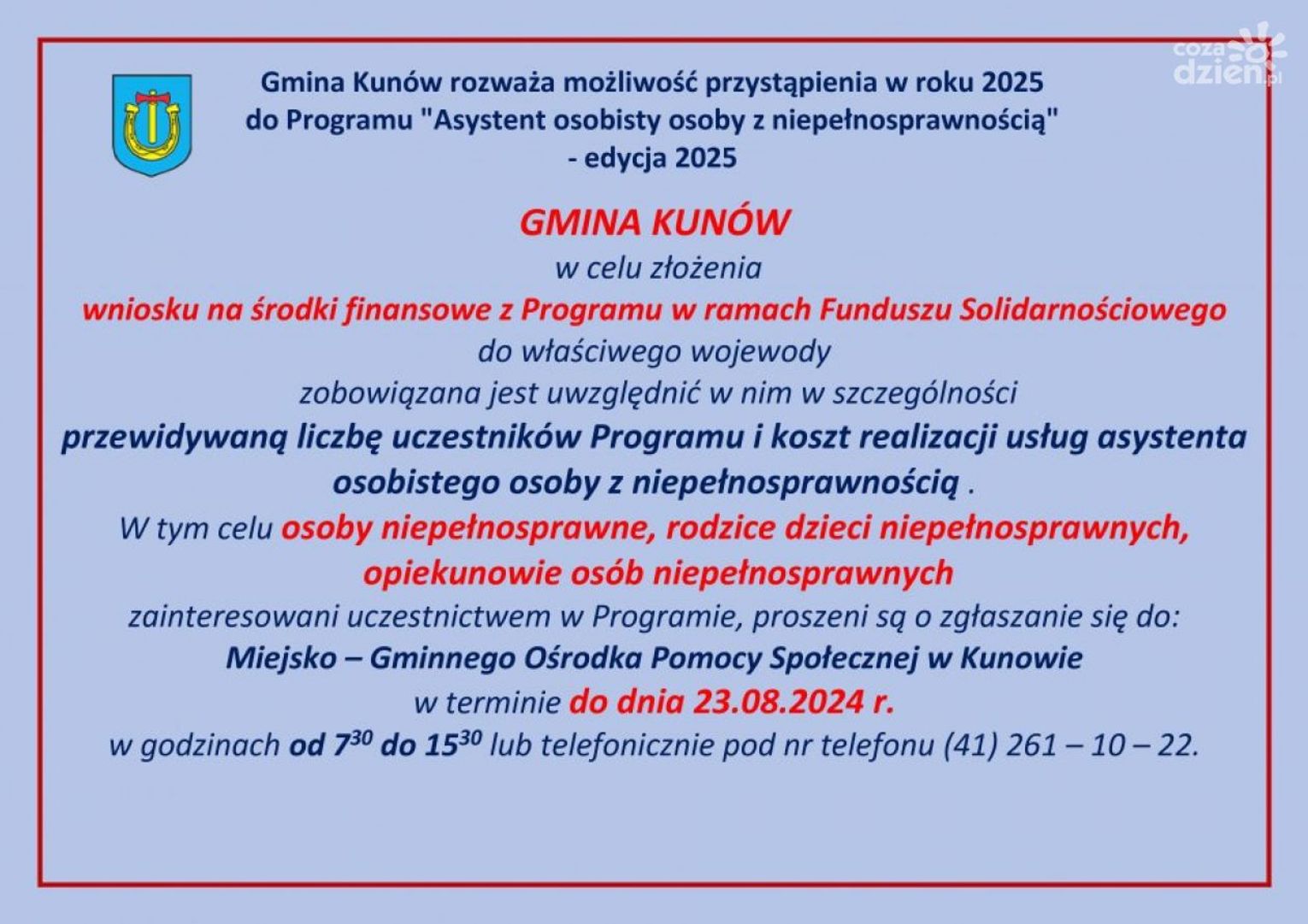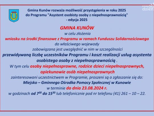 Prośba skierowana jest do osób niepełnosprawnych, rodziców dzieci niepełnosprawnych oraz opiekunów osób niepełnosprawnych będących mieszkańcami gminy Kunów a zainteresowanych udziałem w tym programie a więc korzystaniem z pomocy asystenta osobistego, o zgłaszanie się do Miejsko Gminnego Ośrodka Pomocy Społecznej do dnia 23 sierpnia.