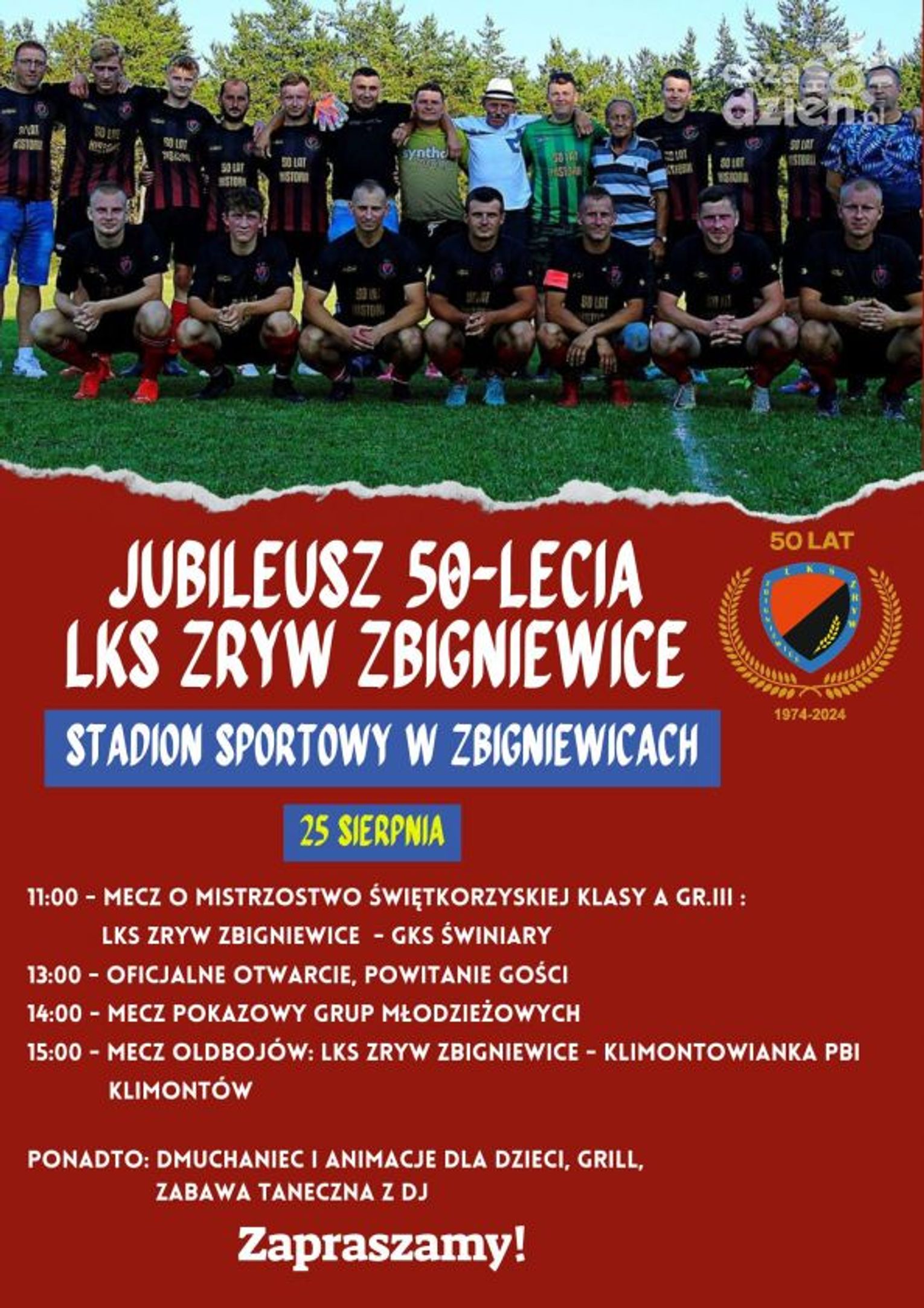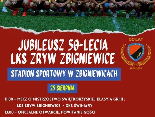 Na stadionie sportowym w Zbigniewicach odbędzie się Jubileusz 50-lecia LKS-u Zrywu Zbigniewice. Wydarzenie rozpocznie się o godzinie 11:00 meczem A-Klasy pomiędzy gospodarzami, a drużyną GKS-u Świniary. Po meczu, planowo o godzinie 13:00, nastąpi oficjalne przywitanie gości i rozpoczęcie uroczystości.