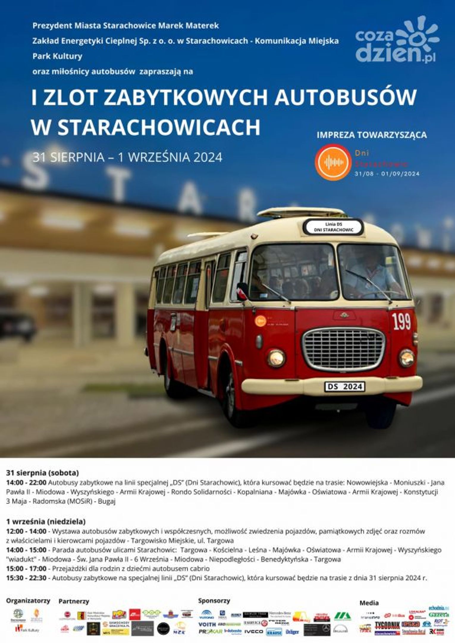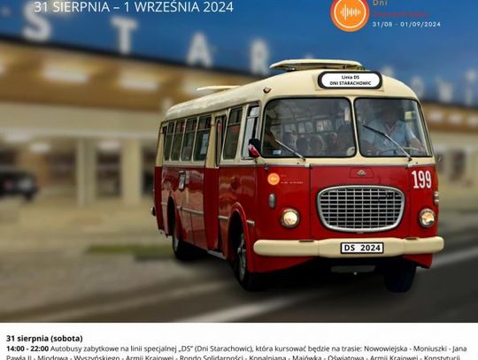 I tak w sobotę od godziny 14 do 22 cztery zabytkowe autobusy wyjadą na specjalnie uruchomioną w tym dniu linię "DS" (Dni Starachowic), która kursować będzie na trasie Nowowiejska - Bugaj. Linia pozwoli mieszkańcom na dogodny dojazd na piknik organizowany z okazji Dni Starachowic na obiektach MOSiR. Obsługiwać ją będą autobusy Jelcz 272 MEX "Ogórek" czy Jelcz. Mex, Ikarus 280.26, Ikarus 280.49, Jelcz PR110U, Jelcz M11 i Autosan H9-35.