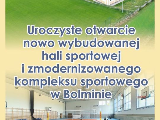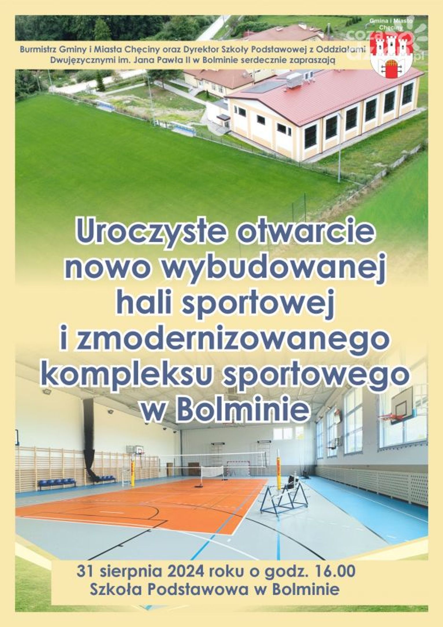 Robert Jaworski, Burmistrz Gminy i Miasta Chęciny, a także Dyrektor Szkoły Podstawowej z oddziałami dwujęzycznymi im. Jana Pawła II w Bolminie zapraszają wszystkich chętnych do udziału w otwarciu wybudowanej hali sportowej. Oprócz powstania nowego obiektu, zmodernizowano też cały kompleks sportowy w Bolminie.