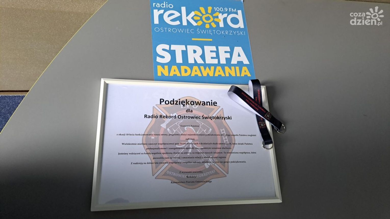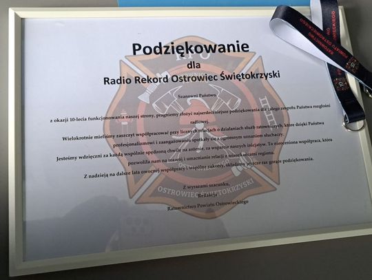 Pamiątkowy dyplom z podziękowaniami za współpracę trafił do ostrowieckiej redakcji Radia Rekord Świętokrzyskie 100.9. FM od portalu Ratownictwo Powiatu Ostrowieckiego. A prowadzą go już od 10 lat strażacy z ostrowieckich jednostek straży pożarnej.