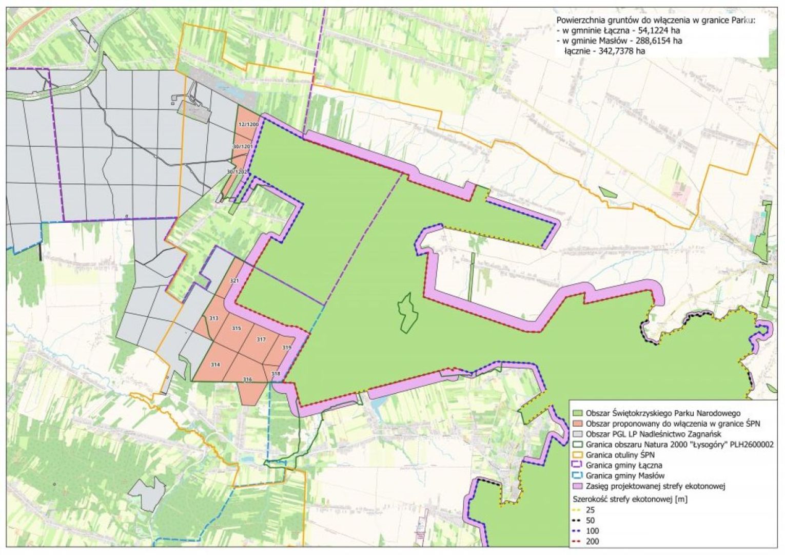 Kolejny plan poszerzenia granic to 343 ha gruntów z gmin Masłów i Łączna. Jednak wg. projektu, mieszkańcy obu gmin mieli by zapewniony dostęp do Parku. Obszary te są już obecnie objęte ochroną w ramach sieci Natura 2000 jako specjalny obszar ochrony siedlisk „Łysogóry”, którego całą pozostałą częścią Świętokrzyski Park Narodowy już zawiaduje. Jednocześnie obszar otuliny Parku nie ulegnie zmianie, dzięki czemu żaden nowy obszar nie będzie podlegał jakimkolwiek ograniczeniom związanym z realizacją inwestycji, czy prowadzeniem działalności gospodarczej przez lokalne społeczności.