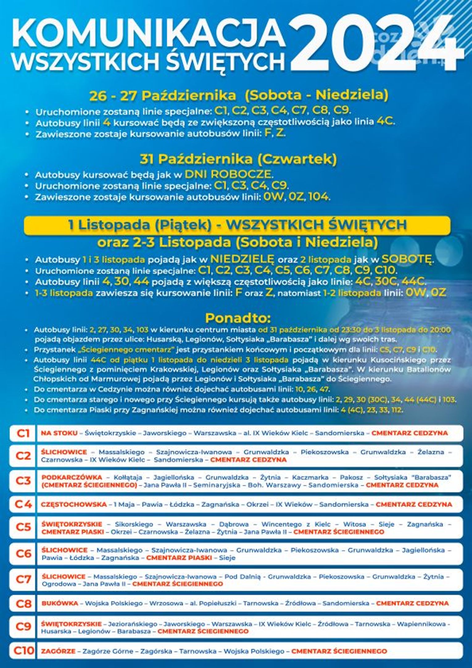 W ostatni dzień października uruchomione zostaną cztery dodatkowe linie, którymi będzie można dojechać do cmentarzy w Cedzynie (C1, C3, C4) oraz przy ul. Ściegiennego (C3, C9). Autobusy w Kielcach będą kursowały według rozkładów jazdy jak w DNI ROBOCZE. Zawieszone zostaną linie 0W, 0Z i 104.