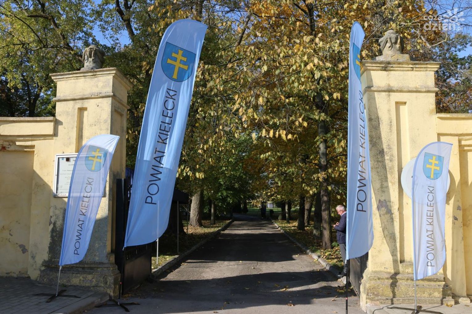Tomasz Pleban podkreślił, że pałac od wielu lat należy do powiatu kieleckiego: - Kiedyś w budynku mieściła się szkoła powiatowa, o którą sukcesywnie dbaliśmy. Więc budynek nie jest zniszczony. Obecnie jest to obiekt zabytkowy, który chcemy zrewitalizować. Dzisiaj podpisujemy umowę na remont zabytkowej bramy głównej, w tym usunięcie wtórnych tynków, odtworzenie nowych oraz konserwację rzeźb, remont ogrodzenia murowego i wymianę zniszczonego ogrodzenia siatkowego na panelowe” - wylicza starosta.