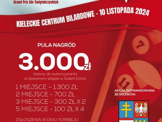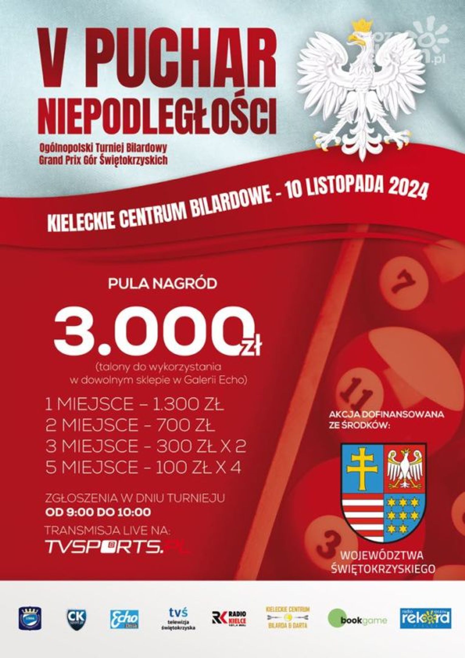 10 listopada w Kieleckim Centrum Bilarda i Darta odbędzie się V edycja Pucharu Niepodległości. Zawodnicy zmierza się ze sobą w odmianie 10 bill. W puli nagród znajduje się aż 3 tys zł (voucher'y do dowolnego sklepu w Galerii Echo). Pierwsze miejsce zgarnie 1300 złotych, drugie 700 zł, trzecie 2x 300 zł, natomiast piąte 4x 100 złotych. Zapisy odbędą się w dniu turnieju o godzinie 09:00. Start rozgrywek zaplanowany jest na godzinę 10:00.