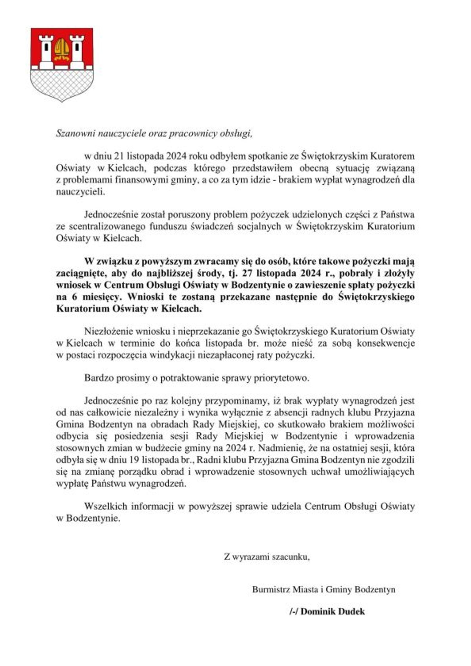 Nauczyciele nie otrzymują wynagrodzeń, a wszystko wskazuje na to, że w najbliższym czasie sytuacja nie ulegnie poprawie. Dominik Dudek Burmistrz Miasta i Gminy Bodzentyn spotkał się z Piotrem Łojkiem Świętokrzyskim Kuratorem Oświaty, aby omówić kwestie związane z pożyczkami zaciągniętymi przez nauczycieli z centralnego funduszu świadczeń socjalnych.