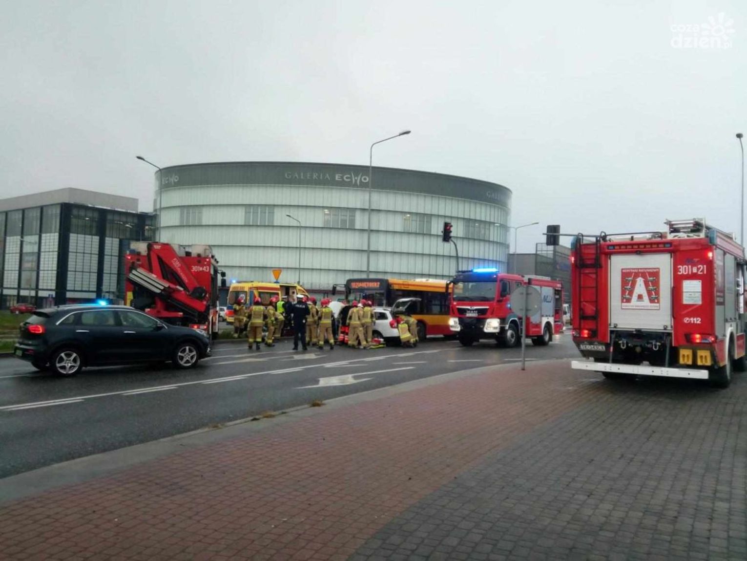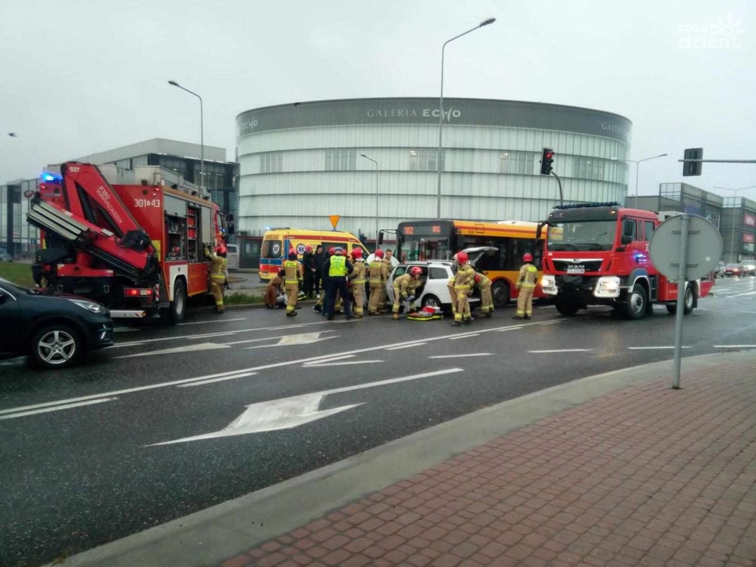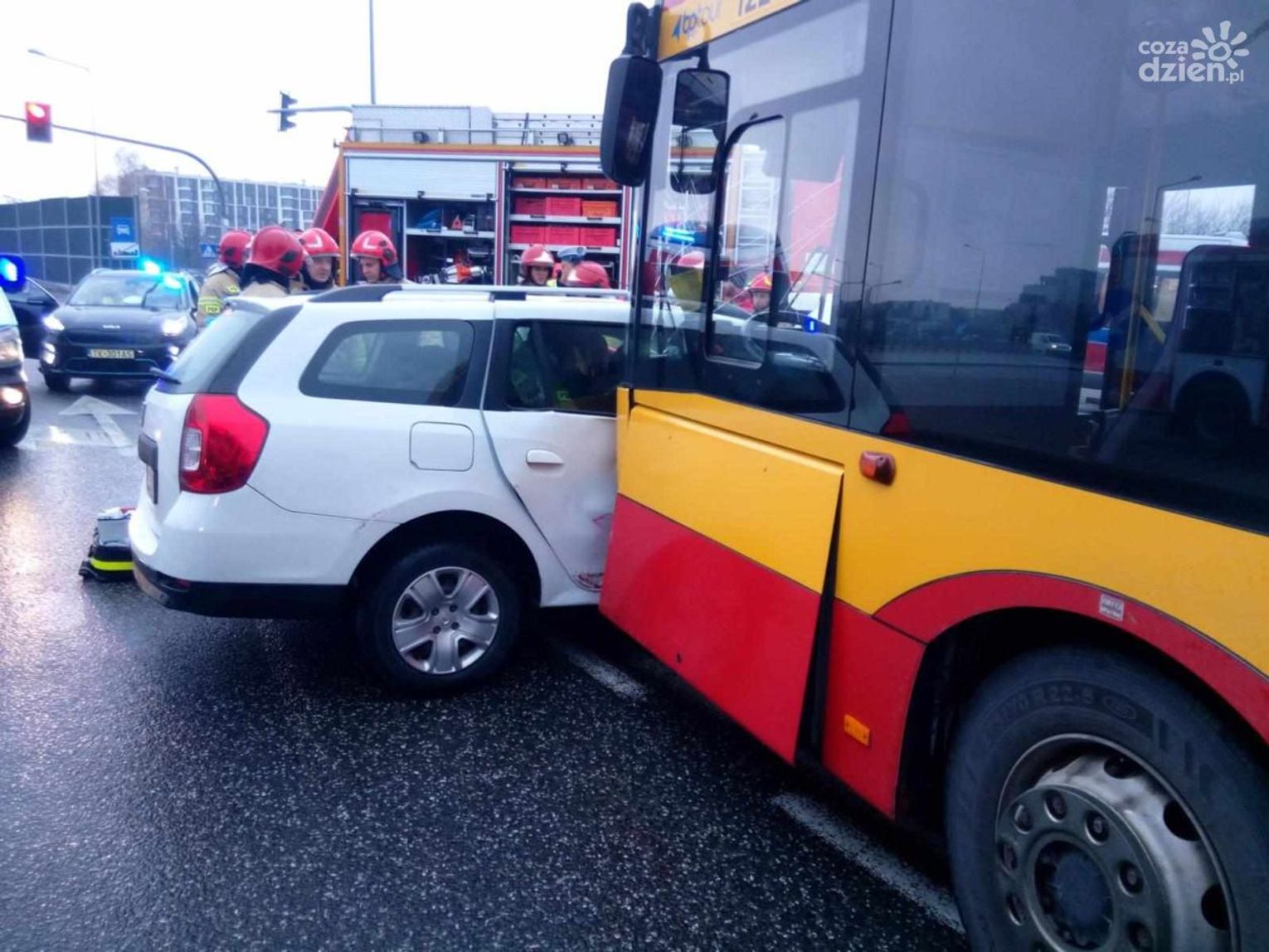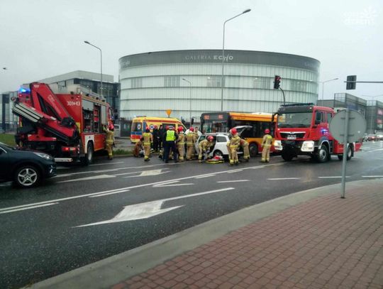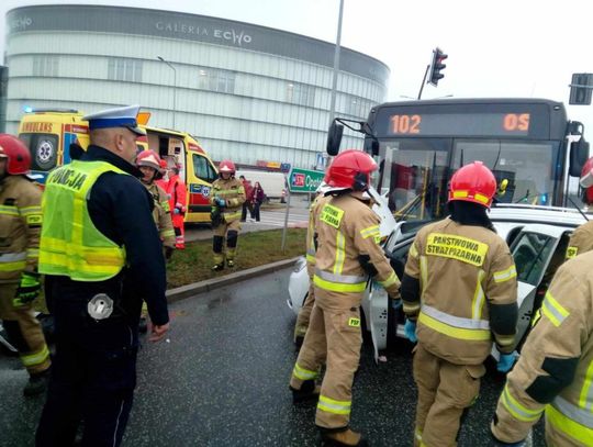 Do zdarzenia doszło po godz. 8.20 na al. Solidarności na wysokości Galerii Echo. Jak informuje mł. asp. Beata Gizowska pojazd marki Dacia zderzył się z autobusem miejskim. W momencie zdarzenia autobusem jechało łącznie 7 osób.