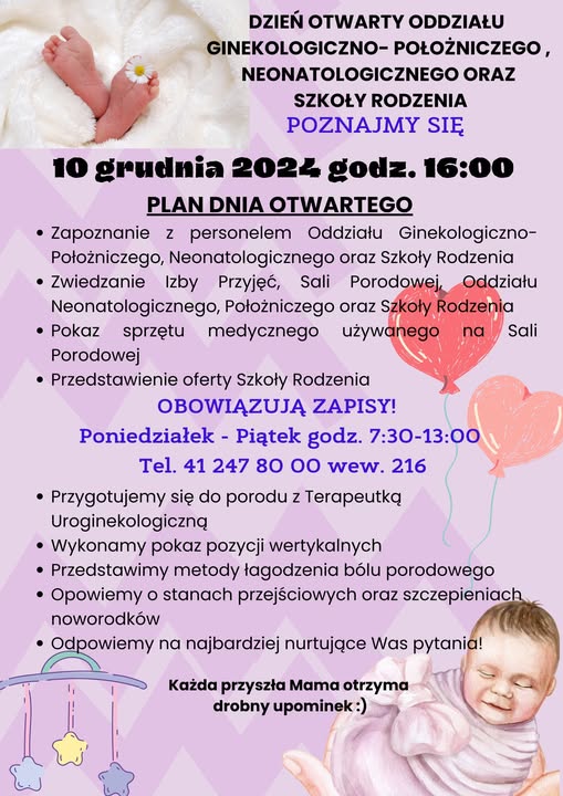 Zwiedzanie sali porodowej, oddziałów położniczego i neonatologicznego oraz szkoły rodzenia.