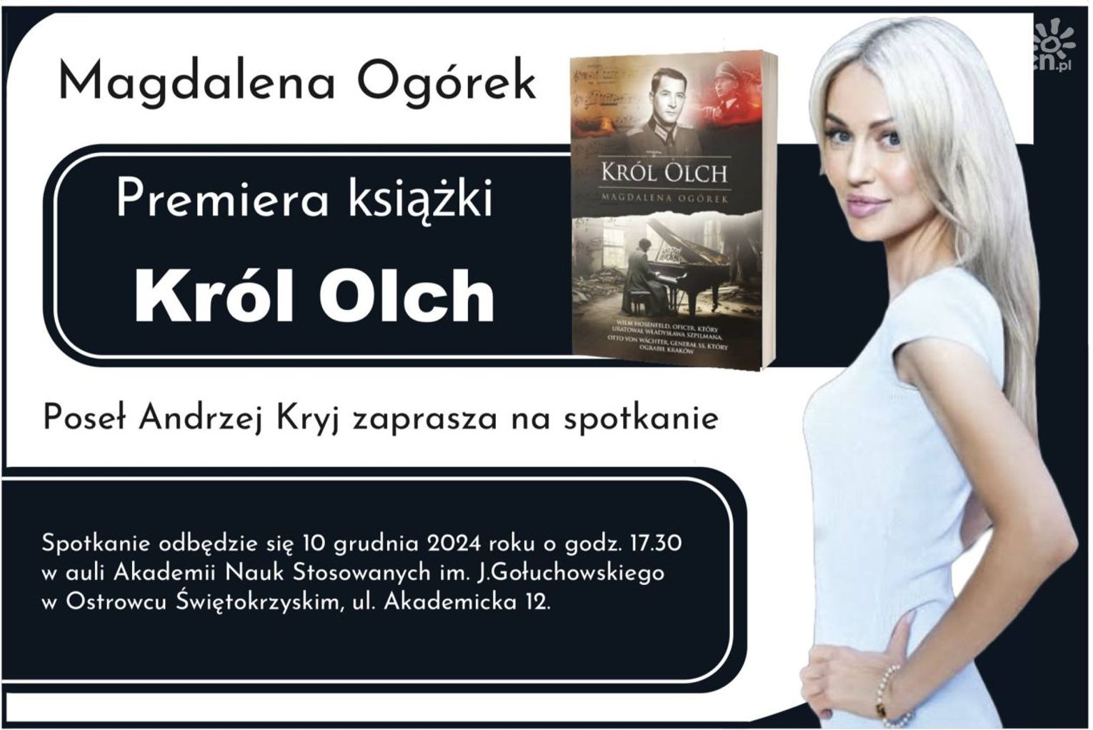 Poseł Andrzej Kryj zaprasza na spotkanie w ramach, którego odbędzie się premiera książki „Król Olch” autorstwa Magdaleny Ogórek. Spotkanie z autorką odbędzie się dziś, tj. we wtorek 10 grudnia o godzinie 17:30. W auli Akademii Nauk Stosowanych im. J. Gołuchowskiego w Ostrowcu Świętokrzyskim, ul. Akademicka 12.