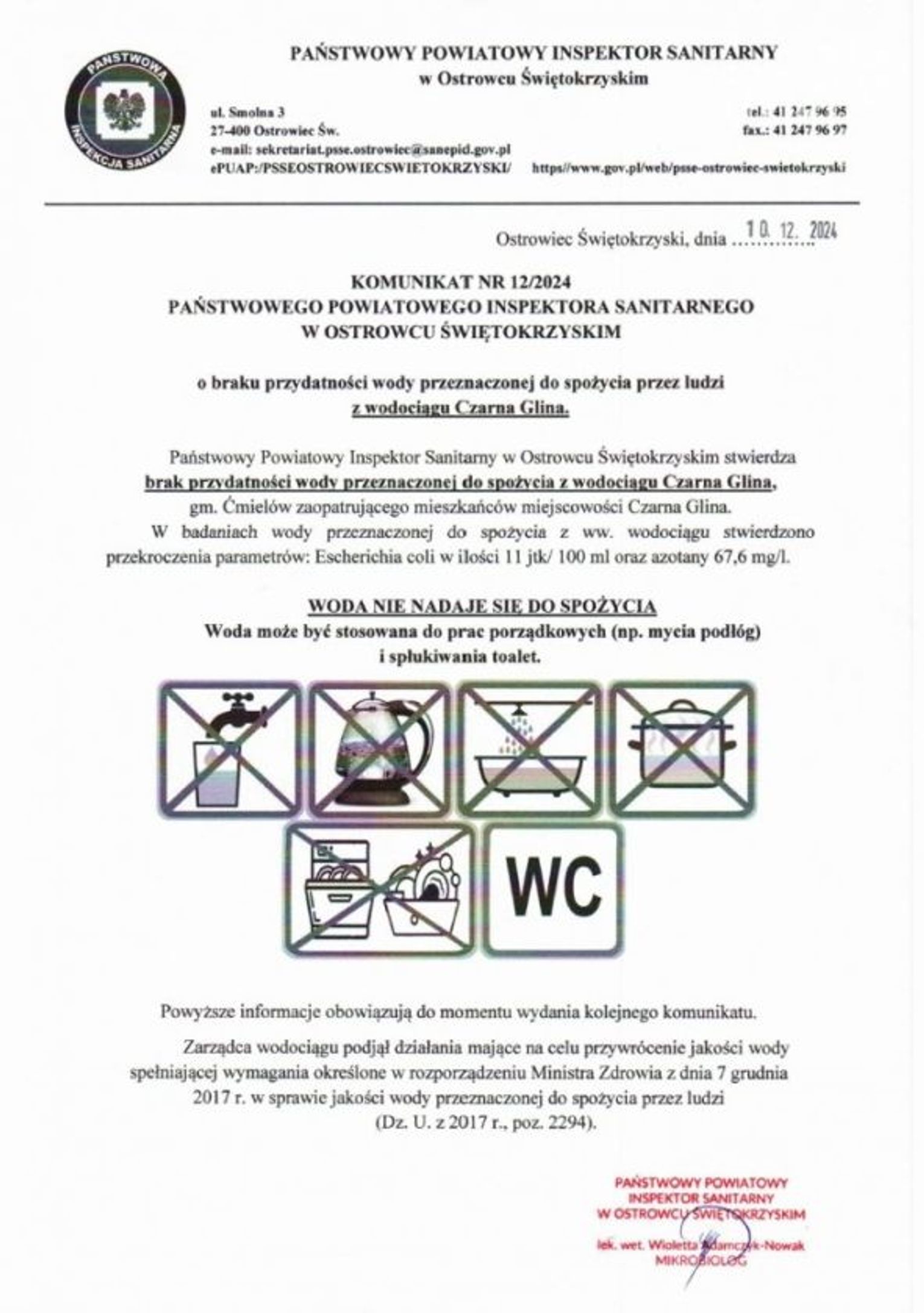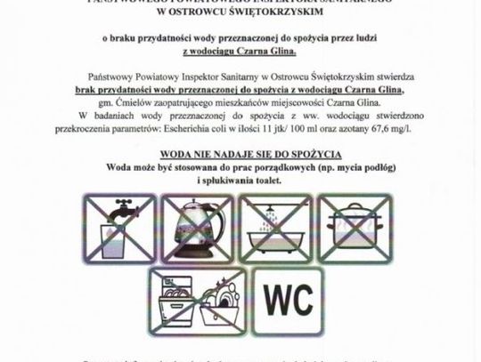 W związku z tym woda nie może być używana do bezpośredniego spożycia przez ludzi, gotowania, mycia się oraz mycia naczyń. Woda z wodociągu w Czernej Glinie w gminie Ćmielów może być obecnie stosowana jedynie do prac porządkowych oraz w toaletach.
