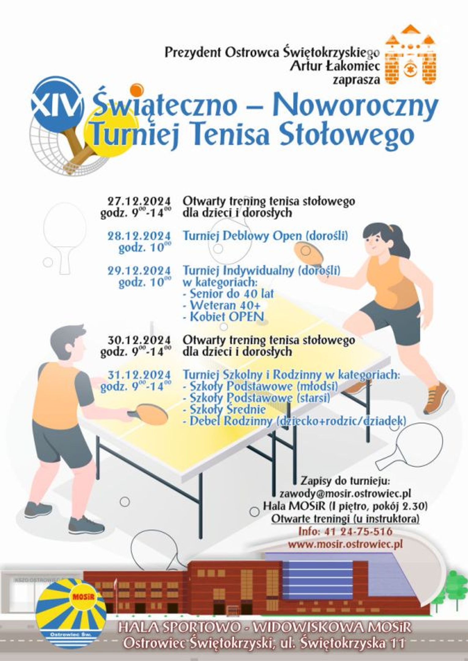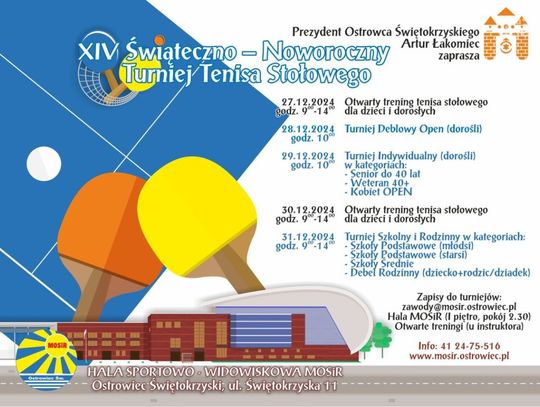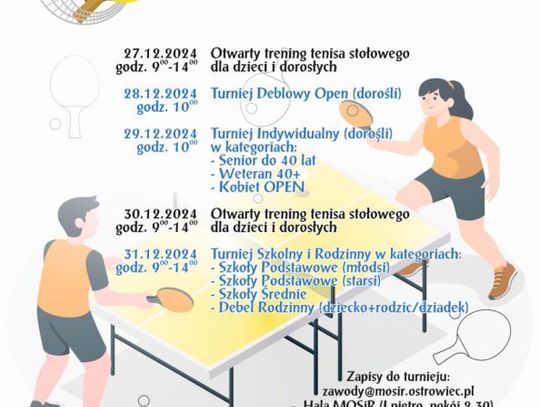 Rywalizację najmłodszych oraz składów rodzinnych również poprzedzi dzień otwartych treningów, na który MOSiR zaprasza wszystkich chętnych w dniu 30 grudnia (poniedziałek, w godz. 9-14). We wtorek od godziny 9 rozgrywany będzie natomiast XIV Świąteczno – Noworoczny Szkolny i Rodzinny Turniej Tenisa Stołowego. Dzieci i młodzież rywalizować będą w kategoriach Szkół Podstawowych (klasy młodsze i klasy starsze) oraz Szkół Średnich, a dokładny podział na kategorie (roczniki) zostanie dokonany po zebraniu wszystkich zgłoszeń. W przypadku małej ilości zgłoszonych dziewcząt kategorie wiekowe tworzone będą bez podziału na płeć. Nowością w świąteczno – noworocznej propozycji MOSiRu są Deble Rodzinne. Tu zespół deblowy powinien składać się z dziecka i osoby dorosłej (rodzic, dziadek). W przypadku dużej liczby chętnych organizator zakłada możliwość podziału na inne kategorie (ze względu na wiek i/lub płeć uczestników). Zgłoszenia do turniejów szkolnych i rodzinnego przyjmowane będą do dnia 30.12.2024r. do godz. 14.00 w Dziale Organizacji Imprez i Marketingu Miejskiego Ośrodka Sportu i Rekreacji w Ostrowcu Świętokrzyskim przy ul. Świętokrzyska 11 (pokój 2.30) i w hali sportowej podczas otwartego treningu lub pocztą elektroniczną na adres [email protected].