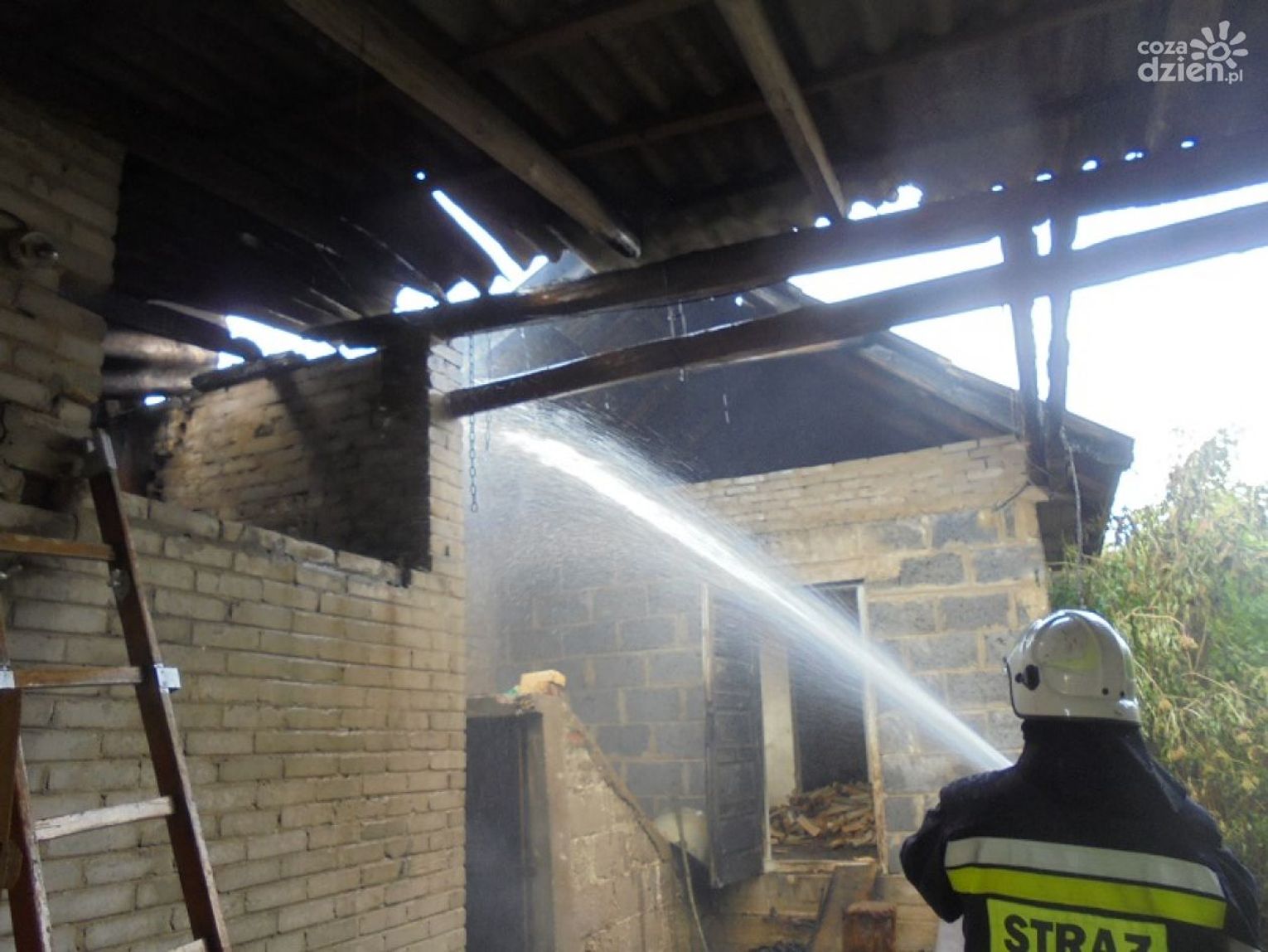 Po przybyciu na miejsce zdarzenia pierwszych zastępów straży pożarnej okazało się, że pali się więźba dachowa na dwóch budynkach gospodarczych, które łączył wspólny dach. Część nadpalonej konstrukcji zapadła się do środka. Strażacy ugasili pożar, równocześnie chroniąc znajdujący się w pobliżu dom. Po zakończeniu akcji gaśniczej rozebrali nadpalone elementy konstrukcji i dokładnie sprawdzili pogorzelisko za pomocą kamery termowizyjnej. Na posesji znajdował się właściciel wraz z sąsiadami, którzy przed przyjazdem strażaków próbowali ugasić ogień. Działania straży pożarnej trwały ponad dwie godziny, brało w nich udział 6 zastępów (19 ratowników).
