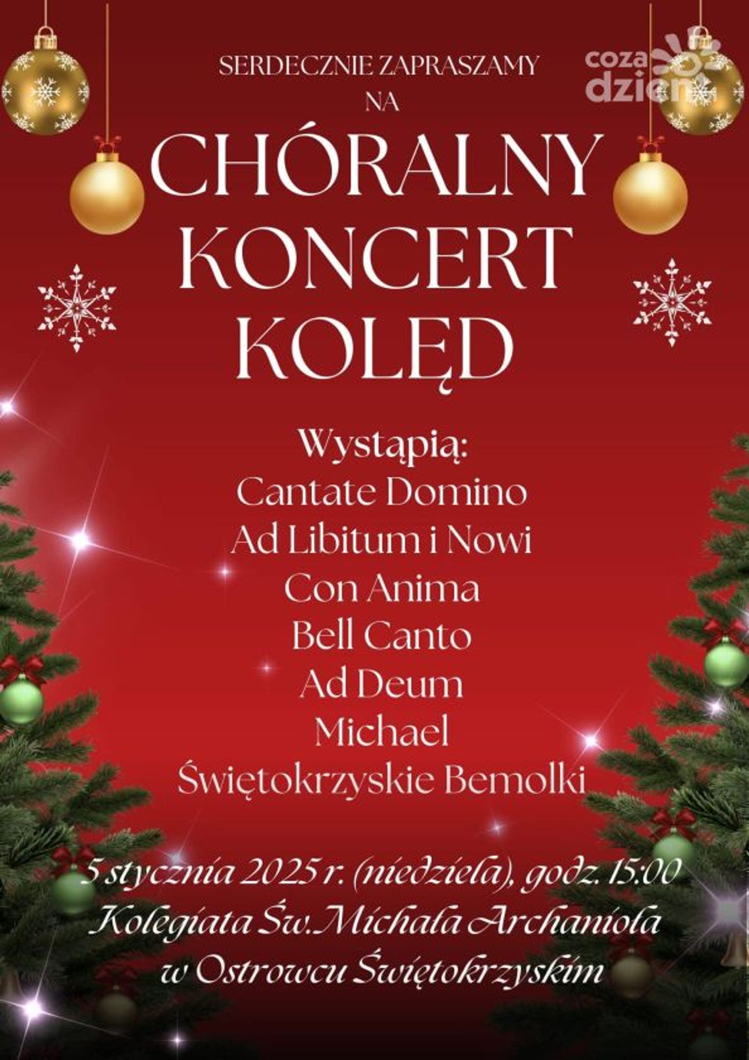 Koncert kolęd w wykonaniu chórów działających na terenie powiatu ostrowieckiego zapraszamy do ostrowieckiej kolegiaty pw. Michała Archanioła w niedzielę, 5 stycznia. Tu o godzinie 15 wystąpią chóry: Cantate Domino, Ad Libitum, Novi, Con Anima, Bell Canto, Ad Deum, Michael i Świętokrzyskie Bemolki.