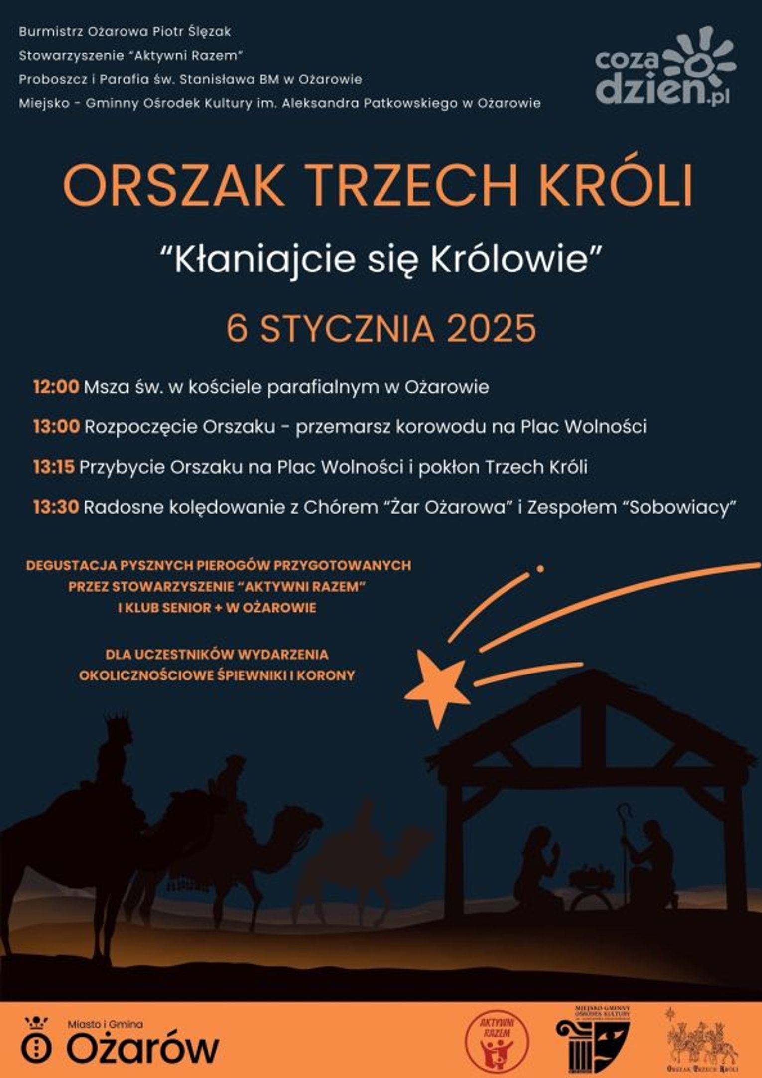 Orszak Trzech Króli przejdzie też przez ulice Ożarowa. Uroczystości rozpoczną się w samo południe mszą się odprawianą w ożarowskim kościele parafialny. Po jej zakończeniu, ok godziny 13 wierni w orszaku przejdą do centrum miasteczka na tamtejszy Plac Wolności. Tu ok. 13.15 nastąpi kulminacja tego wydarzenia, czyli pokłon Trzech Króli a po nim kolędowanie.