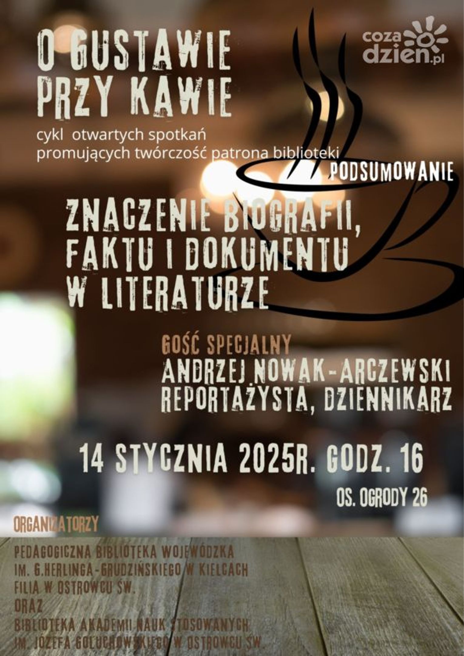 Spotkanie ze znanym ostrowieckim reportażystą i pisarzem odbędzie się w ramach cyklu spotkań "O Gustawie przy kawie" propagujących twórczość patrona tej placówki. Tematem wiodącym będzie znaczenie biografii, faktu i dokumentu w literaturze.
