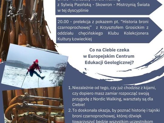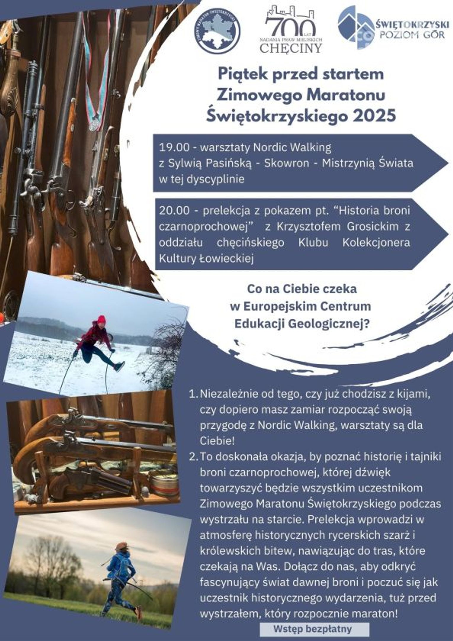 - 20:00 – Prelekcja z pokazem „Historia broni czarnoprochowej”. Krzysztof Grosicki z chęcińskiego Klubu Kolekcjonera Kultury Łowieckiej zaprezentuje fascynującą opowieść o historii broni czarnoprochowej. Dźwięk wystrzału z tej broni zainauguruje Zimowy Maraton Świętokrzyski, tworząc unikalną atmosferę na starcie.