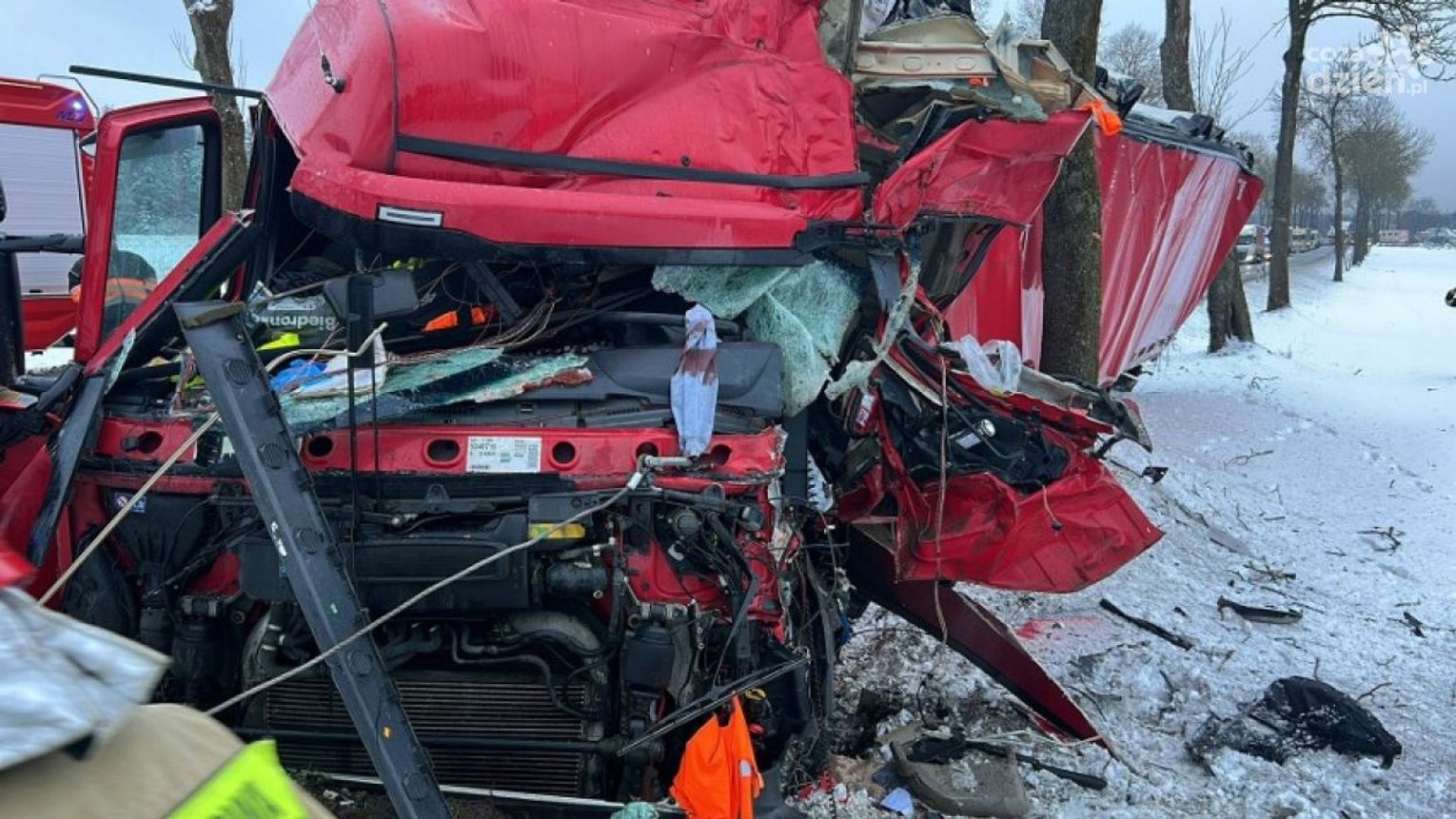 Według informacji przekazanych przez straż pożarną, przód kabiny pojazdu został niemal doszczętnie zmiażdżony, a kierowca utknął w środku. Na miejsce wypadku natychmiast ruszyły służby ratunkowe.