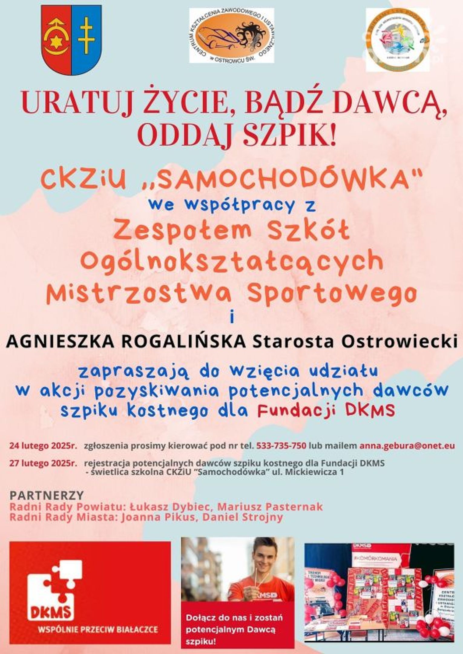 Zgłoszenia przyjmowane są do 24 lutego telefonicznie pod nr tel.: 533 735 750 lub mailowo: [email protected]. Rejestracja potencjalnych dawców szpiku kostnego prowadzona będzie 27 lutego, w świetlicy szkolnej Centrum Kształcenia Zawodowego i Ustawicznego (ul. Mickiewicza 1).