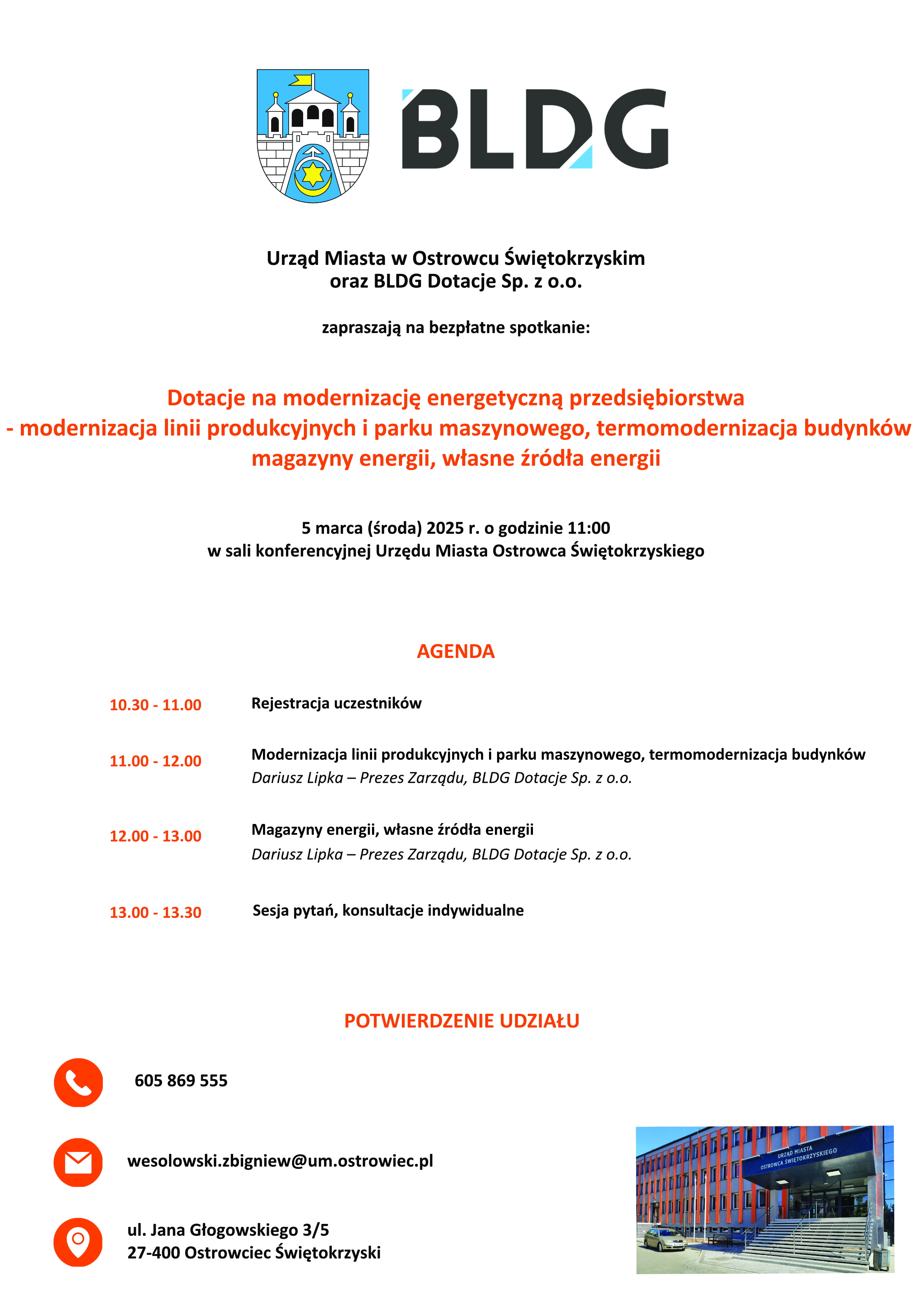 Tematem spotkania będą dotacje na modernizację energetyczną przedsiębiorstw, obejmujące m.in. modernizację linii produkcyjnych, parków maszynowych, termomodernizację budynków, magazyny energii oraz własne źródła energii.