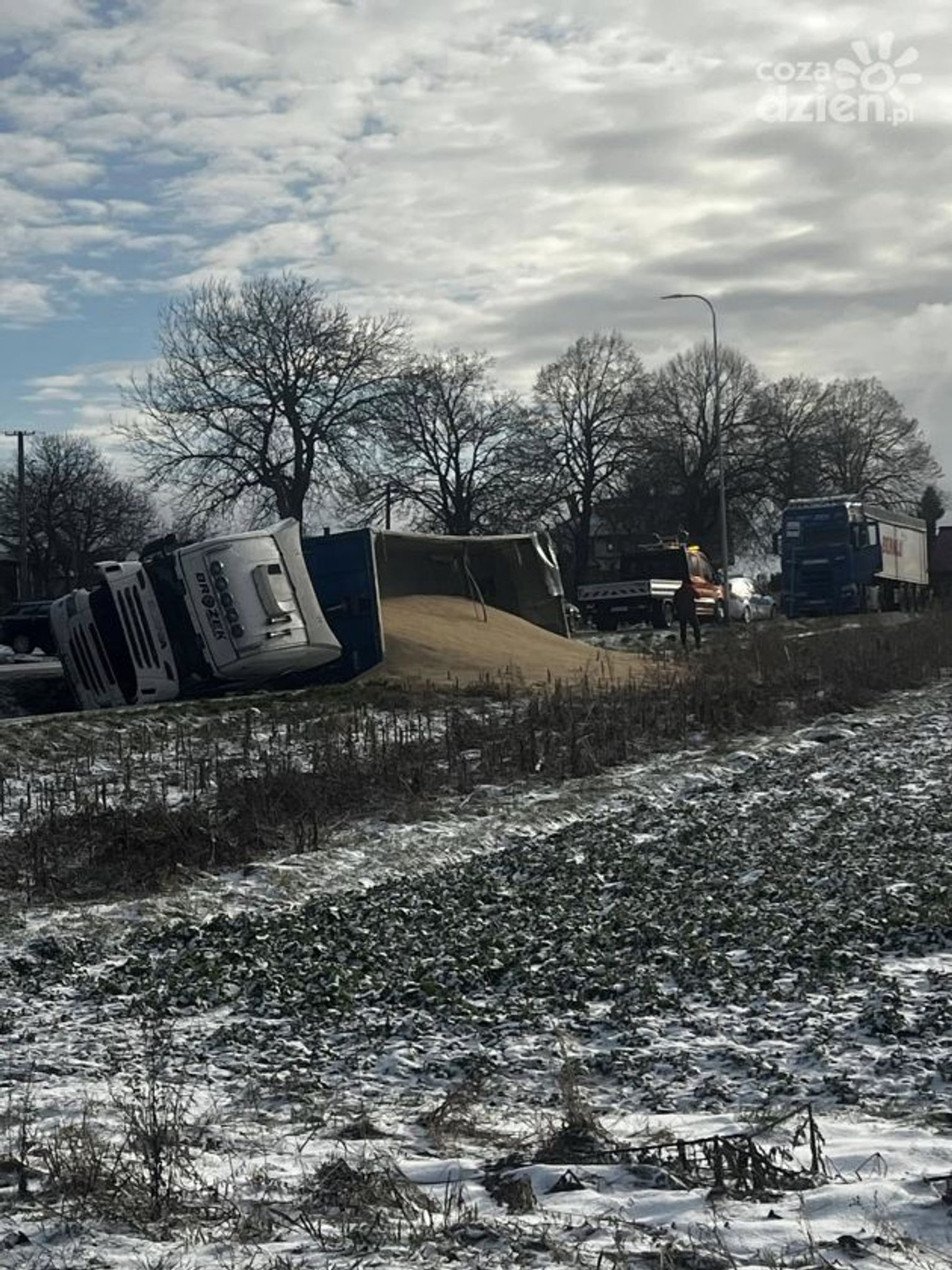 Do groźnego zdarzenia doszło w Gołoszycach na drodze krajowej nr 74. Tam przewróciła się ciężarówka przewożąca zboże, co spowodowało utrudnienia w ruchu i wymagało interwencji służb ratunkowych.