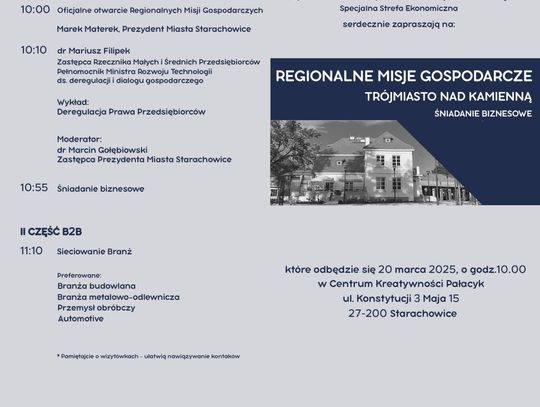 Regionalne Misje Gospodarcze to projekt, który ma zintegrować a przede wszystkim pomów w nawiązaniu współpracy między firmami działającymi na terenie tzw. Trójmiasta nad Kamienną a więc Ostrowca, Skarżyska i Starachowic.