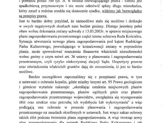 Dalej czytamy, że "... Sytuacja utworzenia nowego planu zagospodarowania pod kątem Rudzkiego Parku Kulturowego, powodującego w konsekwencji zmiany w poprzednim planie, może spowodować roszczenia finansowe właścicieli nieruchomości wobec gminy o czym mówi art. 36 ustawy o planowaniu i zagospodarowaniu przestrzennym, czyli ryzyko niekorzystnej decyzji Sądu. Ekspertyzy prawne oraz oświadczenia właścicieli gruntów dają do zrozumienia, iż jest to bardzo możliwe...".
